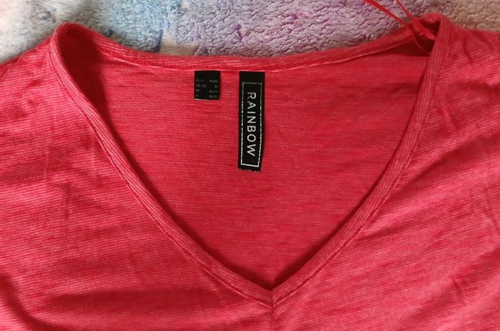 Tee-shirt manches courtes. Bas du Tee-shirt torsadé sur le devant. Marque rainbow. Taille 40-42. Porté 1 ou 2 fois. Col V. #teeshirt #teeshirtfemme #teeshirtmanchescourtes #colv #marquerainbow #taille4042