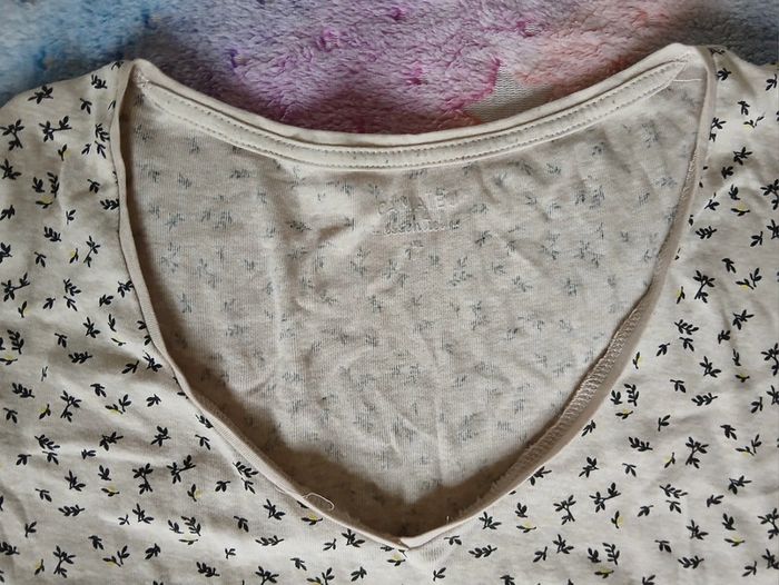 Tee-shirt manches courtes. Col en V. Décor feuille. Couleur crème. Taille XL. Marque camaïeu #teeshirt #teeshirtfemme #couleurcreme #camaieu #taillexl