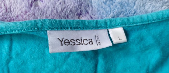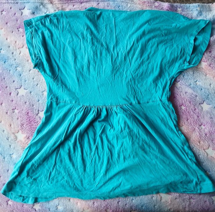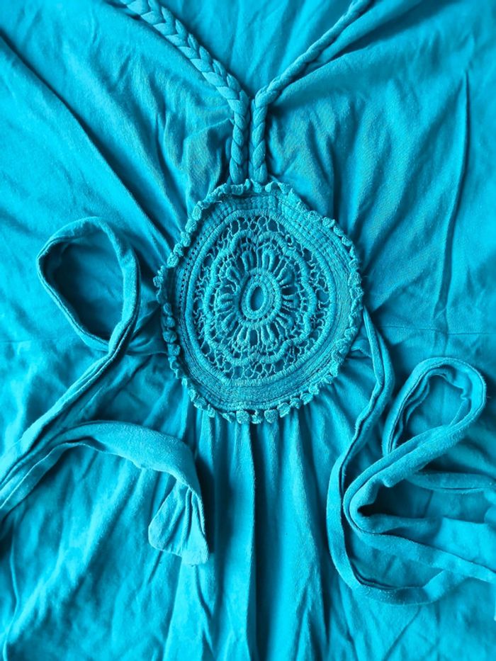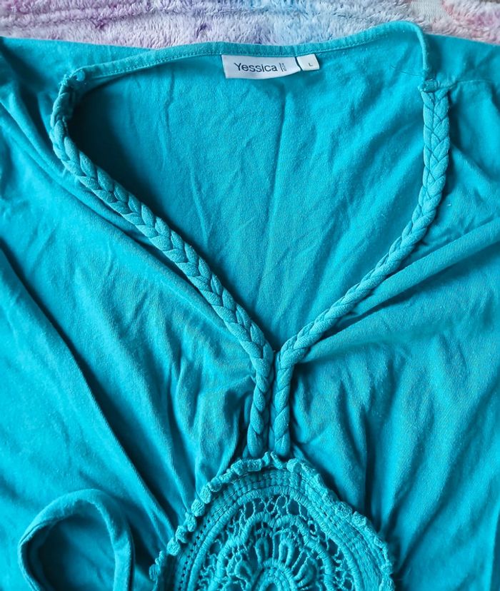 Tunique bleu azur. Décoration style crochet. Lanière pour attacher dans le dos. Col V très léger décolleté. Taille L. Marque Yessica by C&A. #tuniquefemme #taillel #yessica #byc&a