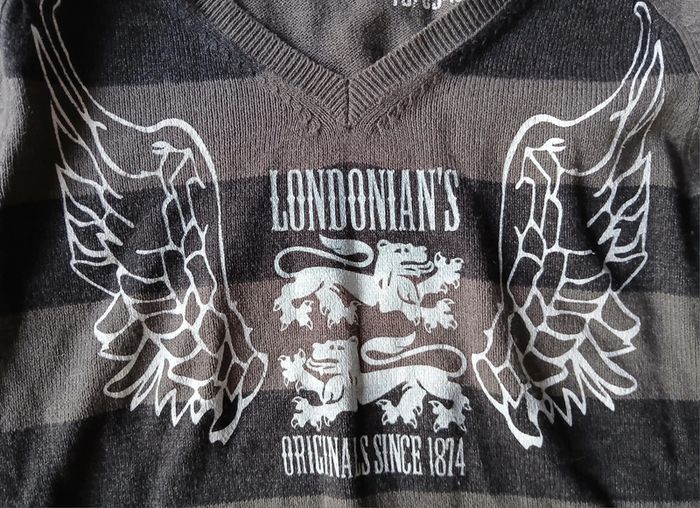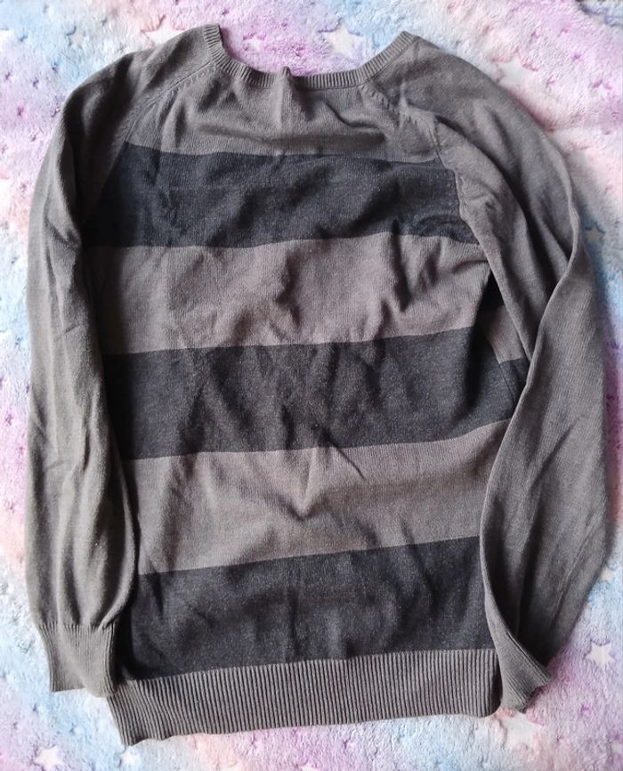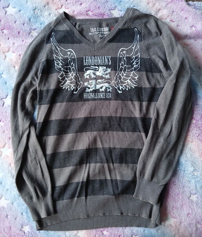 Pull manches longues. Couleurs gris marron rayé. Écriture et design blanc. Col V. Taille M. Marque Tex. #pullhomme #pullmancheslongues #colv #tex #taillem