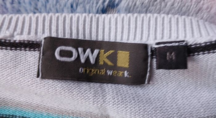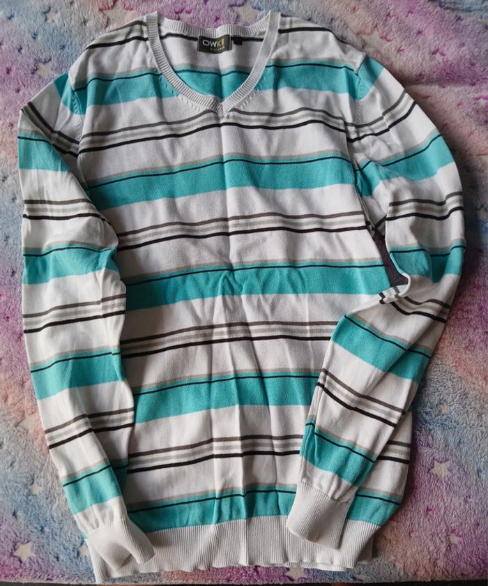 Pull manches longues. Pull rayé bleu azur, blanc et noir. Matière agréable. Col en V. Taille M #pullhomme #pullrayé #taillemM #marqueowk #owkhomme #owk