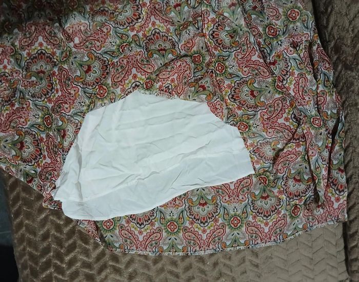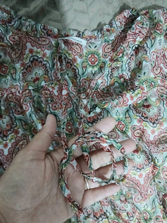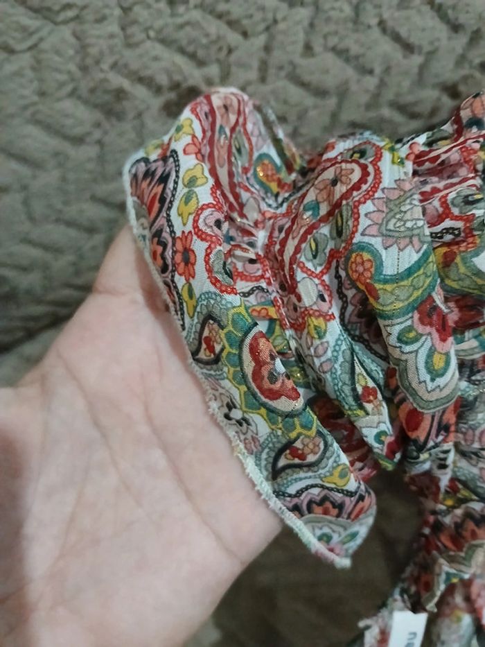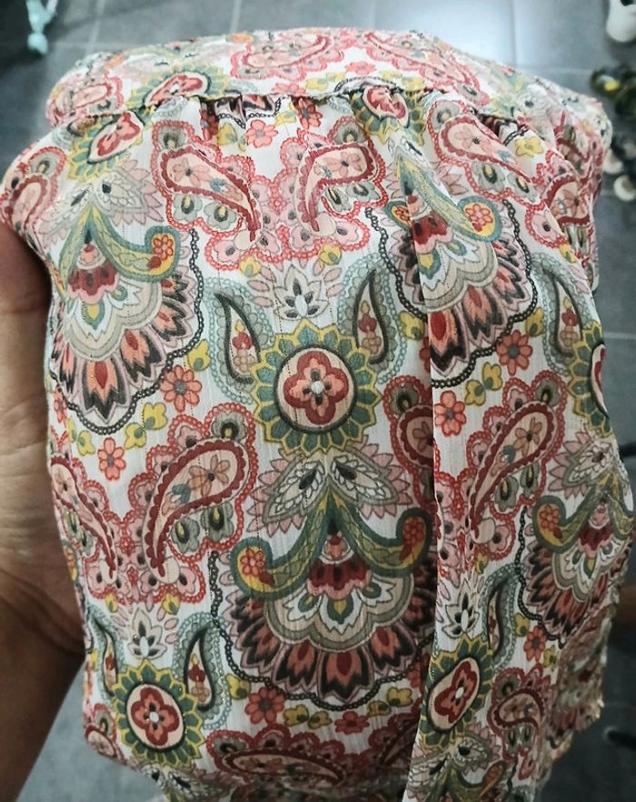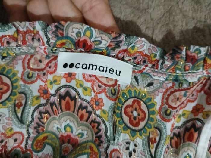 Robe longue d'été. Doublure en dessous du haut jusqu'au bas. Manches courtes. Élastique au niveau de la taille. Petit lassage niveau haut pour fermer ou non. Très léger décolleté. Sur toute la robe par ci par la petit tissage en "or". Robe très légère. Taille 42-44. Juste essayée donc neuve. #robeété #robelongue #taille4244 #camaieu