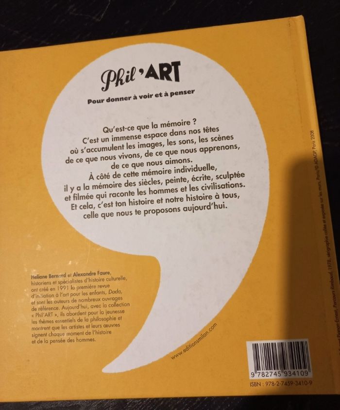 Livre Phil'art, c'est quoi- la mémoire ? ,en très bon état, pour enfant 9-13 ans, 2008 Paris , édition : Milan jeunesse.