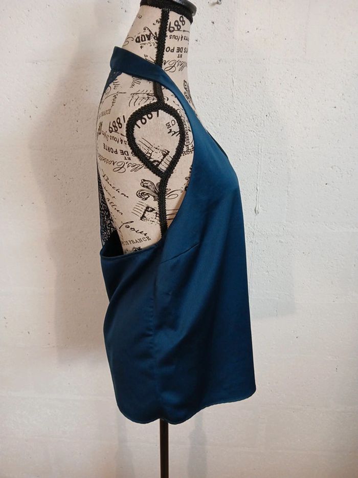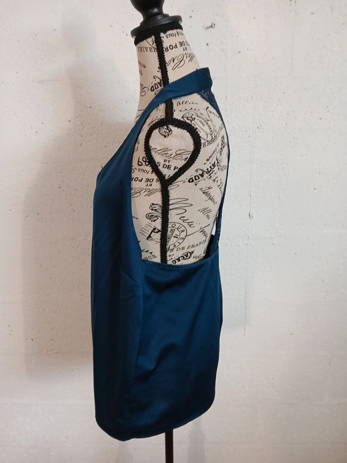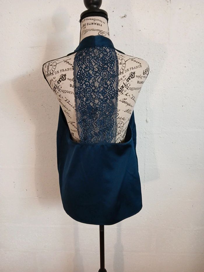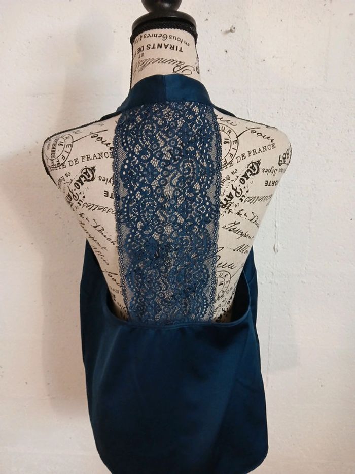 Haut de pyjama bleu satiné Très bon état Motifs à dentelle fins dans le dos Plus d étiquettes mais correspond à une taille M/L Largeur aisselles 45 cm Longueur dos 72 cm