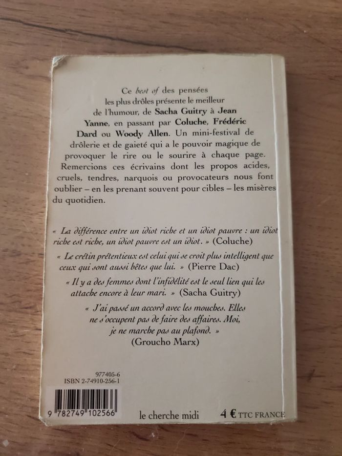 Ce best of des pensées les plus drôles présente le meilleur de l'humour, de Sacha Guitry à Jean Yanne, en passant par Coluche, Frédéric Dard ou Woody Allen. Un mini-festival de drôlerie et de gaieté qui a le pouvoir magique de provoquer le rire ou le sourire à chaque page. Remercions ces écrivains dont les propos acides, cruels, tendres, narquois ou provocateurs nous font oublier - en les prenant souvent pour cibles - les misères du quotidien.