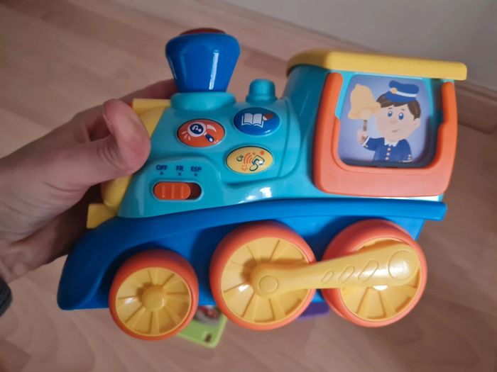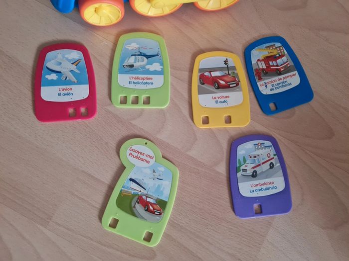 Jeu éducatif français/ Espagnol train bilingue marque HaP-P- Kid, répète le nom des mots lorsqu'on insère la carte etc Quelques autocollants un peu abîmés mais en parfait état de fonctionnement. Maison non fumeur