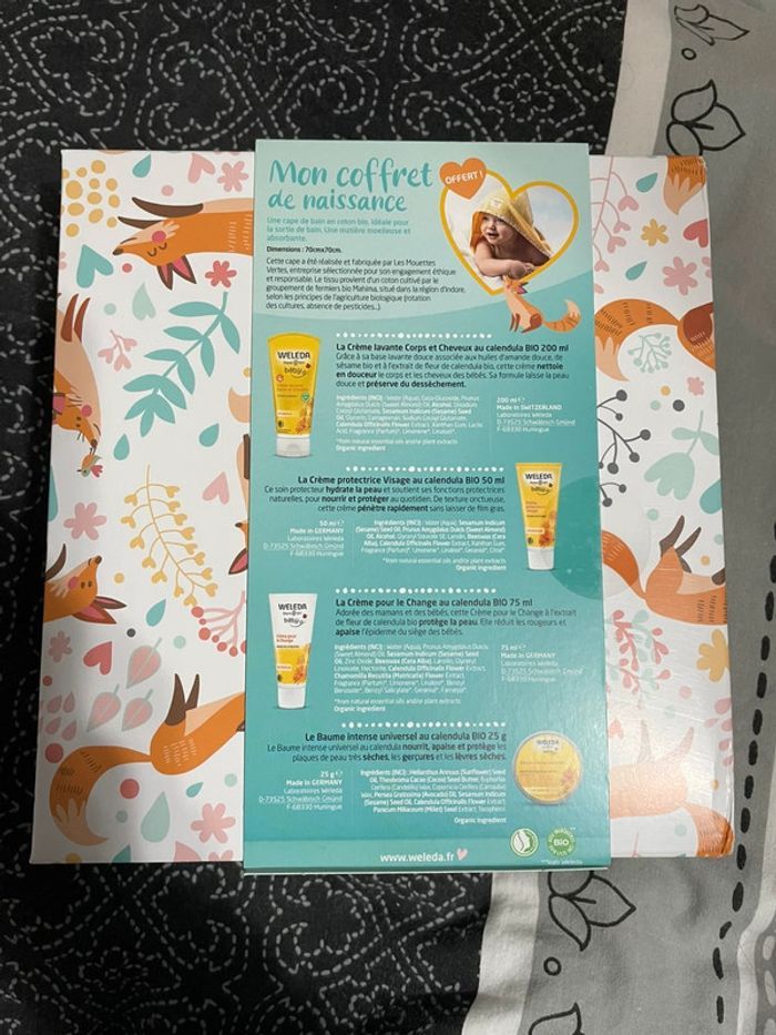 Un joli coffret de naissance avec une cape de bain et des produits au calendula , tout ça dans une boîte en carton réutilisable pour ranger les choses de bébé 👼 Neuf