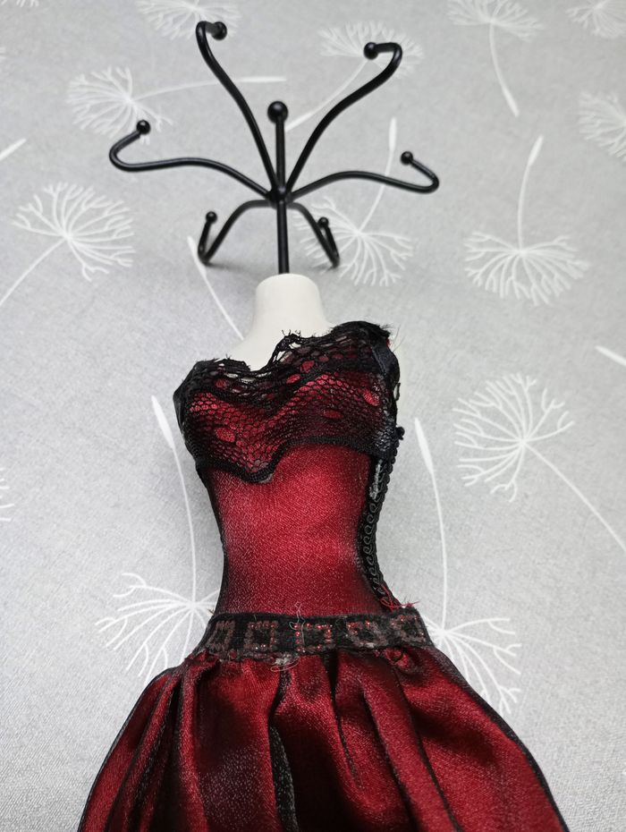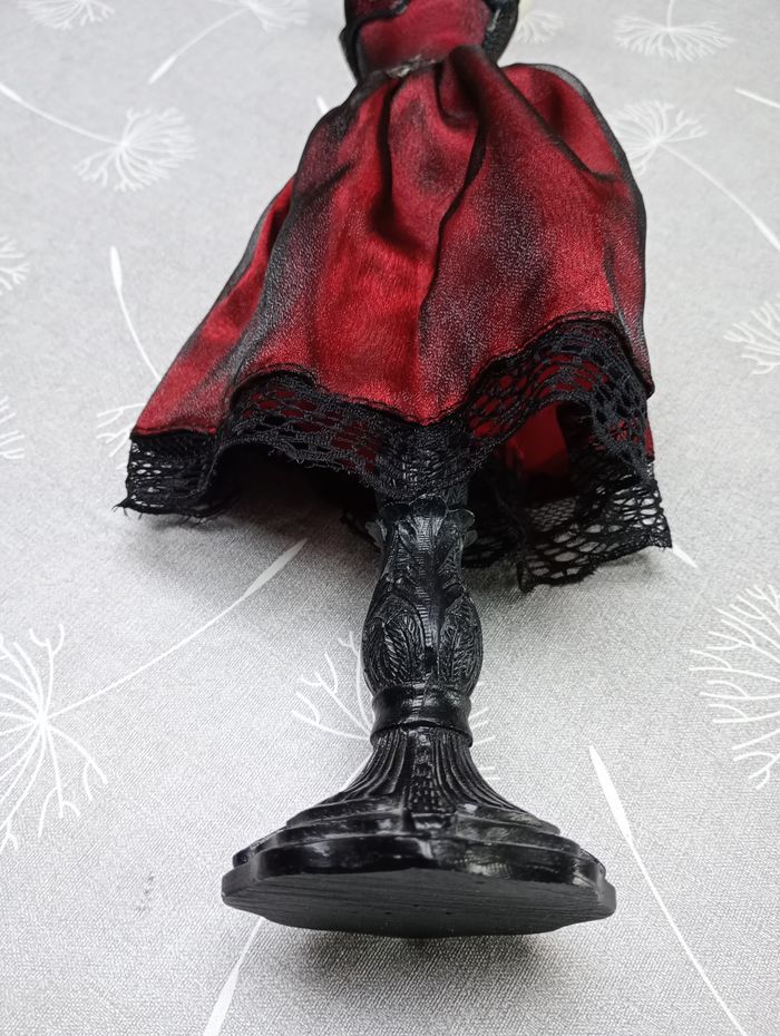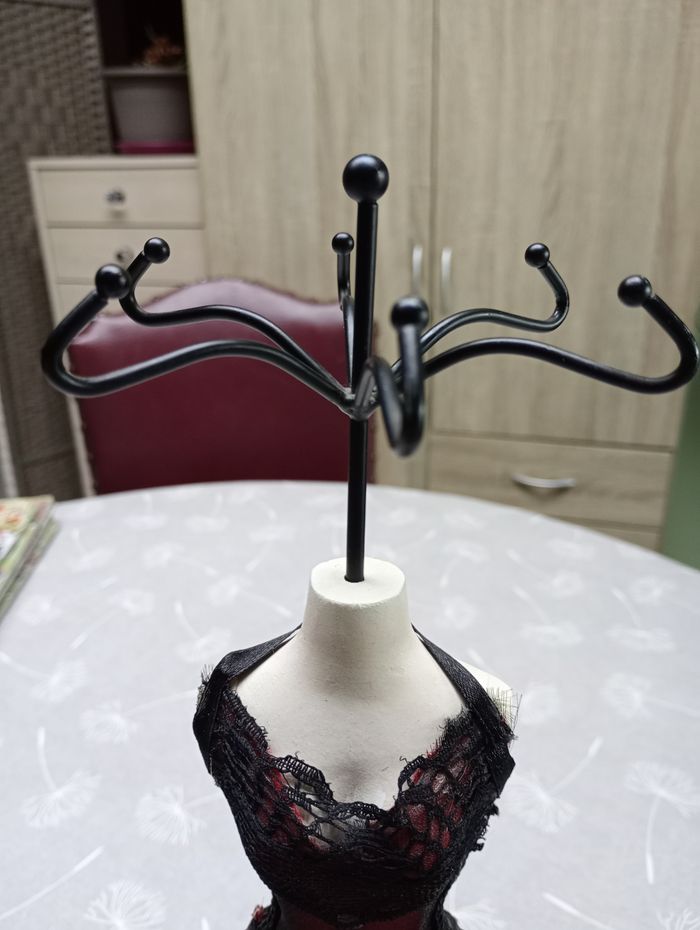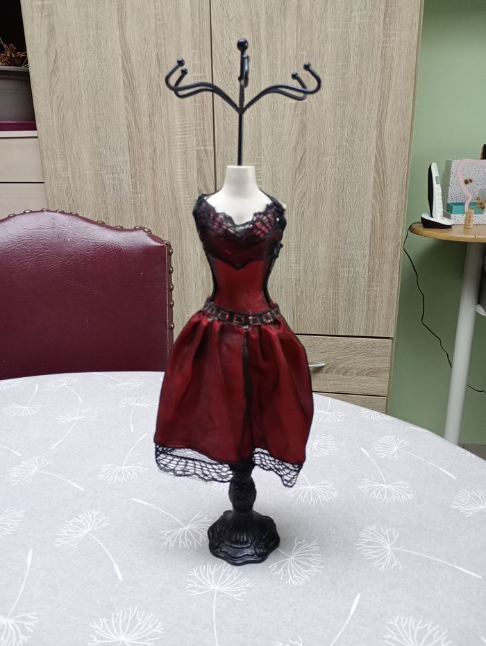 Porte bijoux assez lourd avec belle robe rouge foncé. Hauteur : 40 cm. Très bon état.