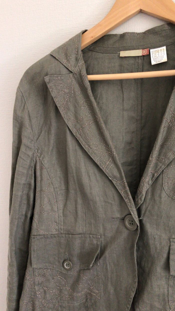 Joli veste courte kaki avec incrustation qui lui donne tout son charme ! 100% lin taille 42 de la marque La Redoute belles finitions les boutons de rechanges sont fournis très peu portée donc en excellent état