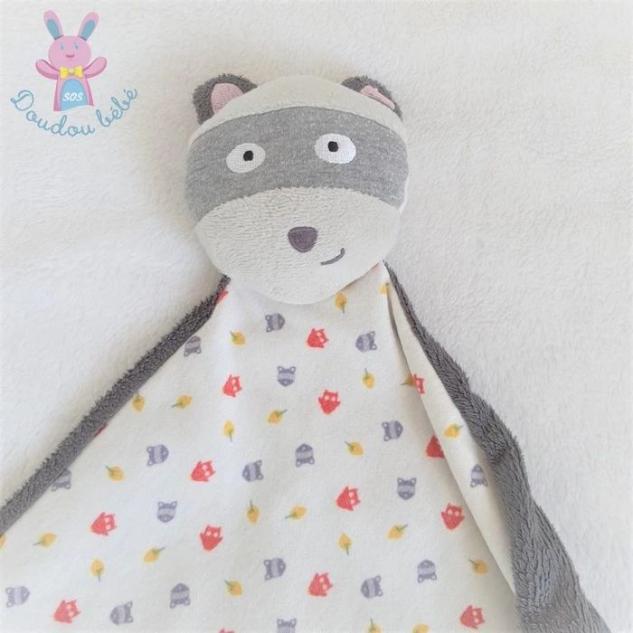 BOUTIQUE PRO SOS DOUDOU BEBE (+ de 3000 doudous en stock) PAS D'ENVOI PAR VINTED GO ---------------------------------------- Doudou plat RATON LAVEUR / RENARD masqué velours gris Tissu blanc avec petits motifs hiboux feuilles VERTBAUDET (réf D-1594) Occasion très bon état #sosdoudouvertbaudet
