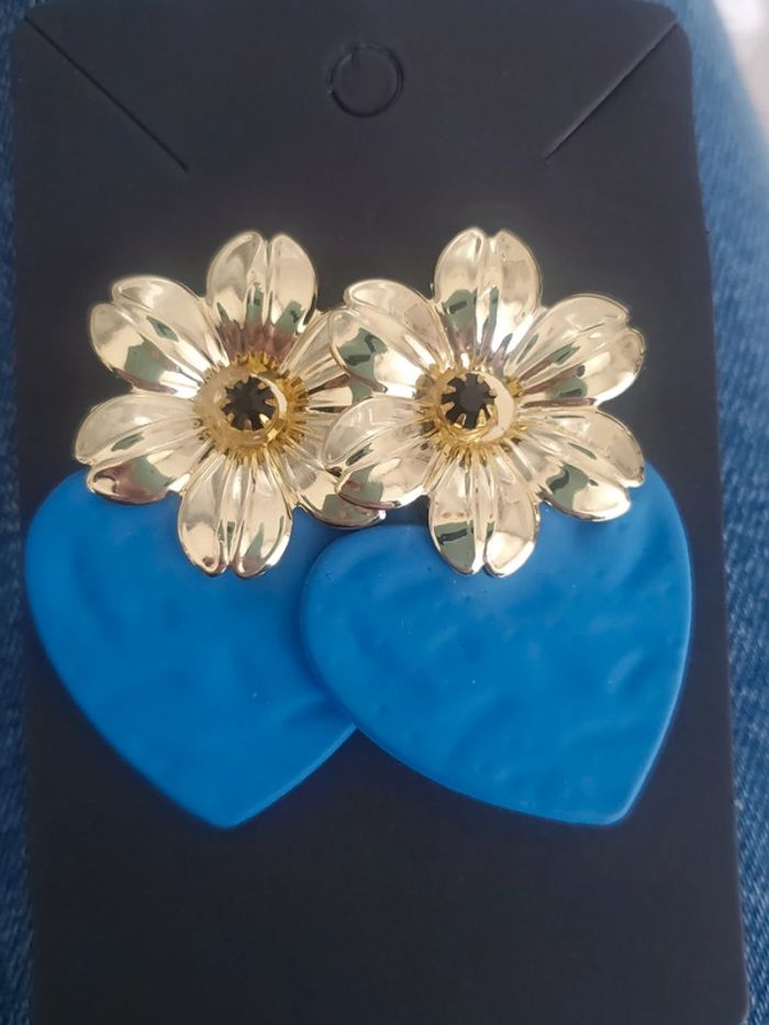 Boucles d'oreilles tendance fashion cœur bleu et fleur dore - photo numéro 1