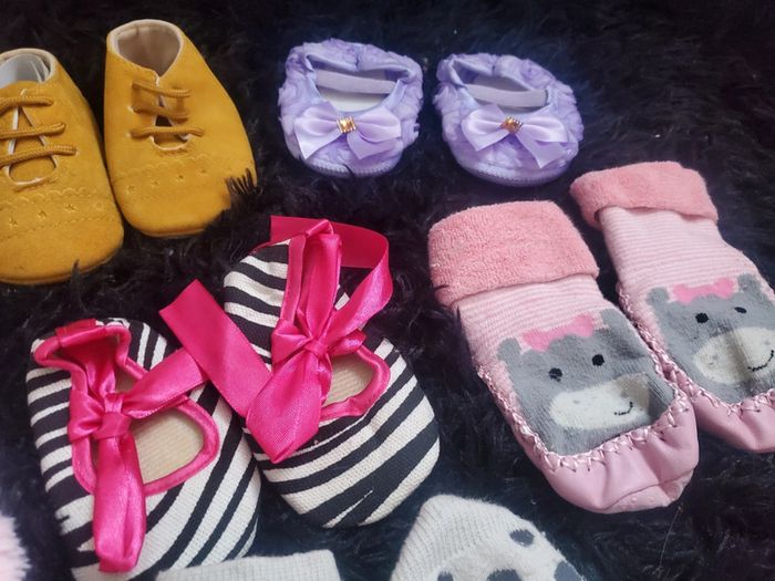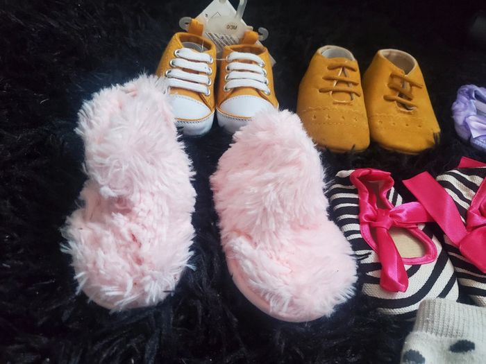 Gros lot de 7 paires de chaussures pour bébé de 0 à environ 12 mois 2 chaussette chausson 2 ballerine semelle souple 1 paire de basket moutarde avec etiquette 1 paire de derbie moutarde 1 paire de bottine fourré rose 3€ le lot 💮 Lien chaussure fille : #bijoux76210chaussuresfille