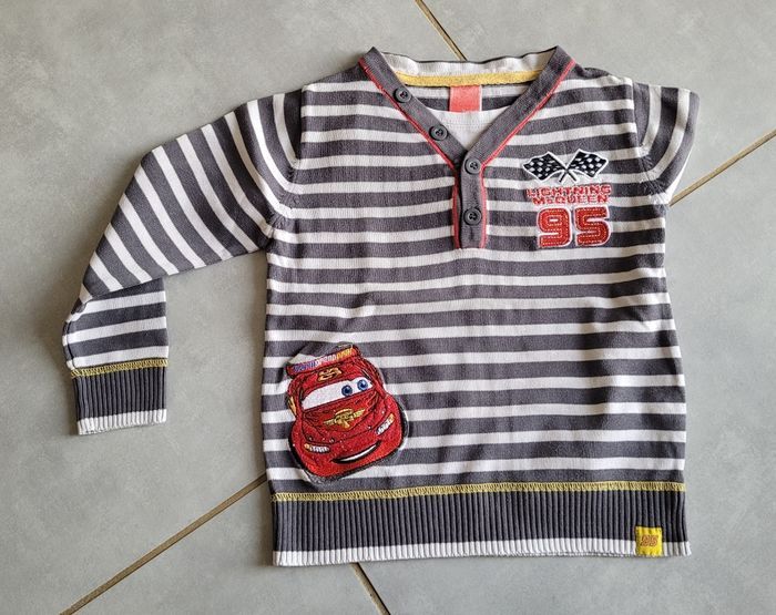 Pull col V, blanc rayé gris avec motif, de la marque C&A, taille 4 ans (104 cm), en très bon état. Article lavé pour la vente.
