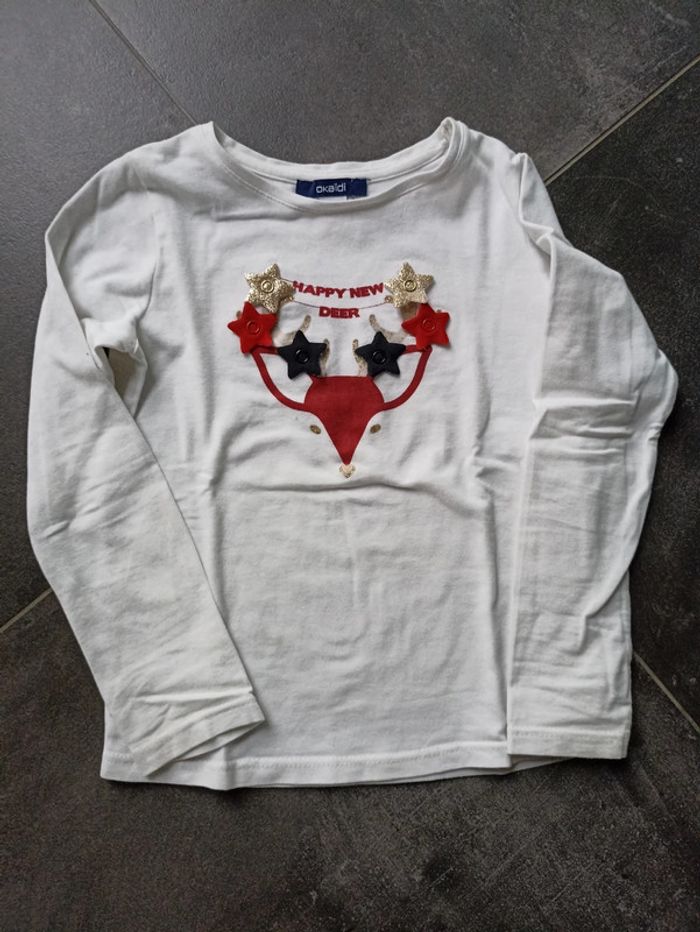 T-shirt manches longues blanc avec motif cerf 🦌 avec étoiles 🌟 pressions (on peut modifier leur place). Le doré des "bois" est un peu effacé (voir photo) mais caché par les étoiles.