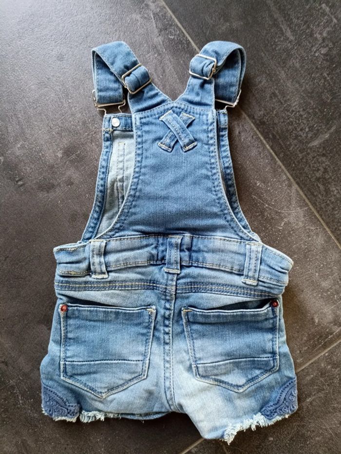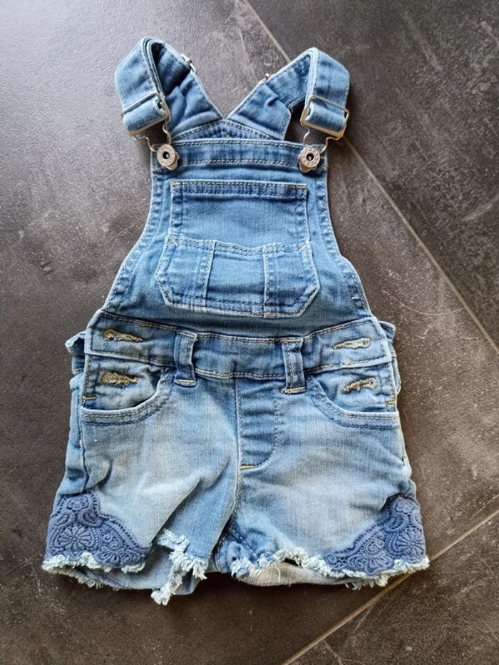 Salopette short en jeans avec détails dentelles bleu sur les côtés du sport. Bretelles réglables.