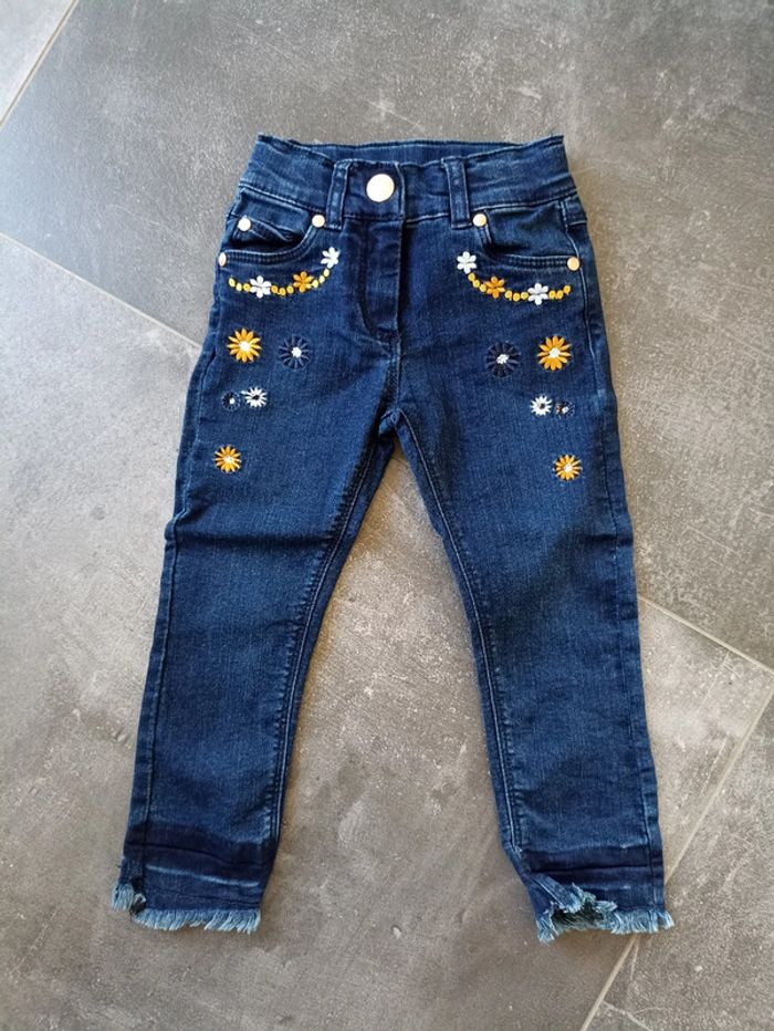 Jeans bleu foncé avec détails broderie jaune moutarde et blanc T-shirt manches longues blanc avec écriture brodée bleu foncé et moutarde