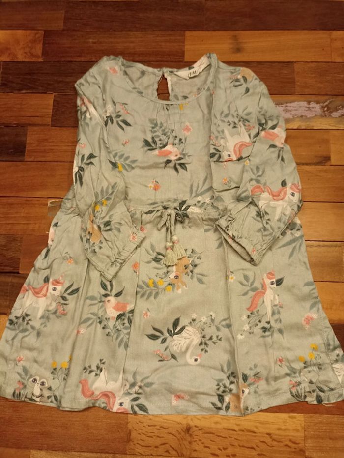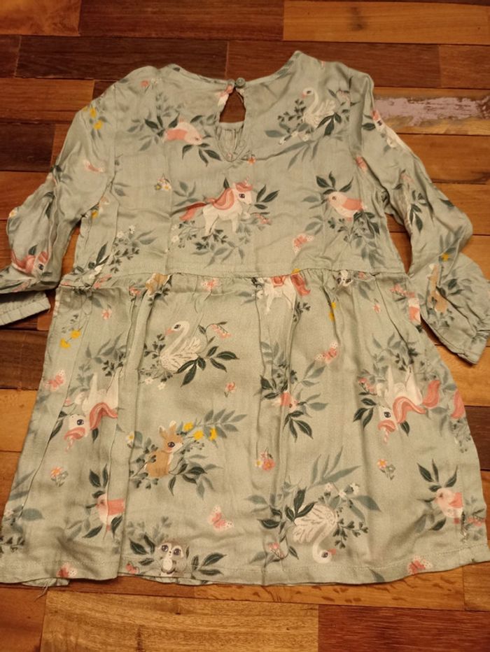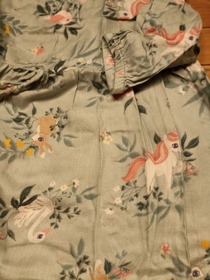 Robe légère manches longues couleur vert d'eau avec motif lapin 🐰, licorne 🦄, cygne 🦢 raton laveur 🦝 et oiseau 🐦.