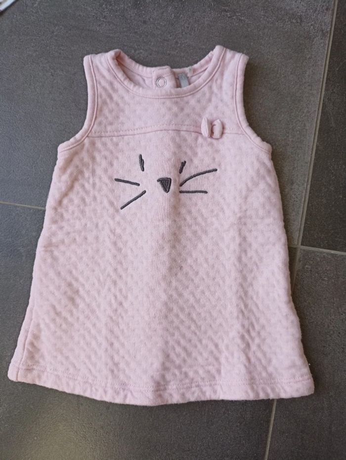T-shirt manches longues avec motif chat et rayures rose pâle et blanc (manches) Robe sans manches Legging ligné balnc et rose pâle