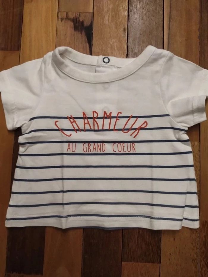 T-shirt ligné blanc et bleu avec écriture orange