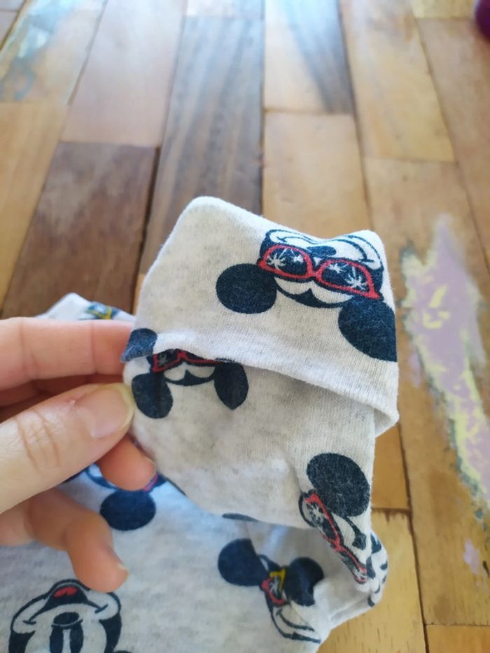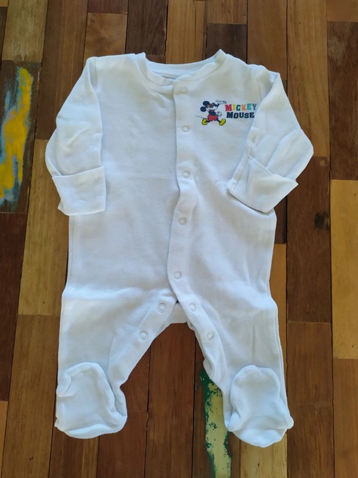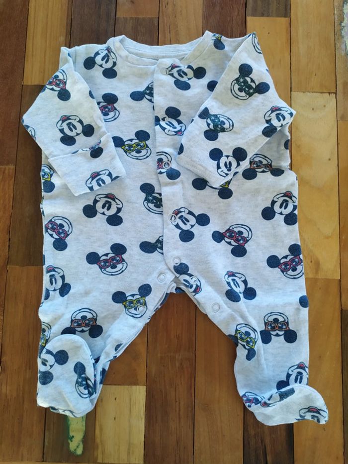 3 pyjamas une pièce avec ouverture devant. Il y a un système au bout des manches (effet moufle) voir photo. 2 pyjamas gris clair avec têtes de Mickey 1 pyjama blanc avec petite écrit et petit dessin de Mickey
