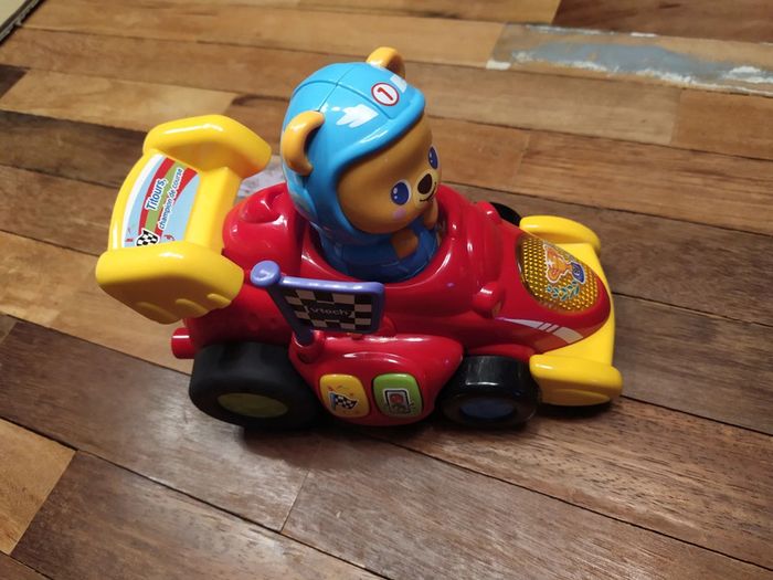 Voiture VTech en parfait état 2 façons de faire avancer la voiture (soit en appuyant sur la tête de l'ourson ou soit pas retrofriction + de 40 chansons, mélodies, sons et phrases. Une chouette manière de découvrir les chiffres, la course automobile et les couleurs.
