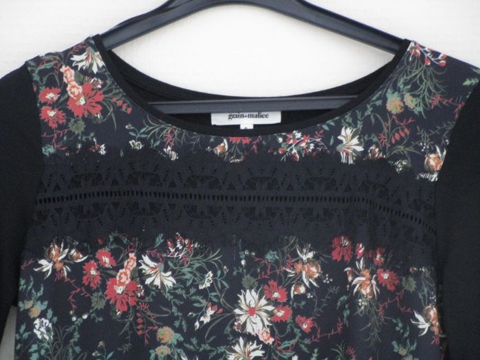 Blouse noire imprimé floral de marque Grain de Malice taille S (36) Bande de dentelle sur la poitrine (transparente) Manches 3/4 100% polyester Dos 97% viscose/3% élasthanne Largeur carrure : 36 cm Largeur poitrine : 45 cm Longueur : 62 cm NEUVE, étiquette manquante mais petit lien plastique encore présent #mamanbrade59femme36