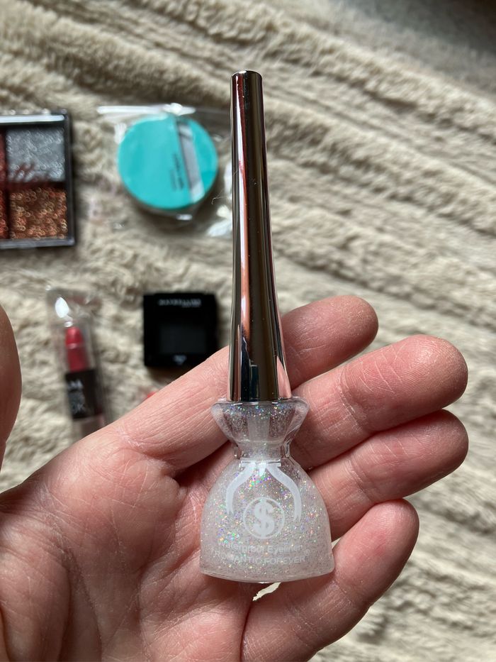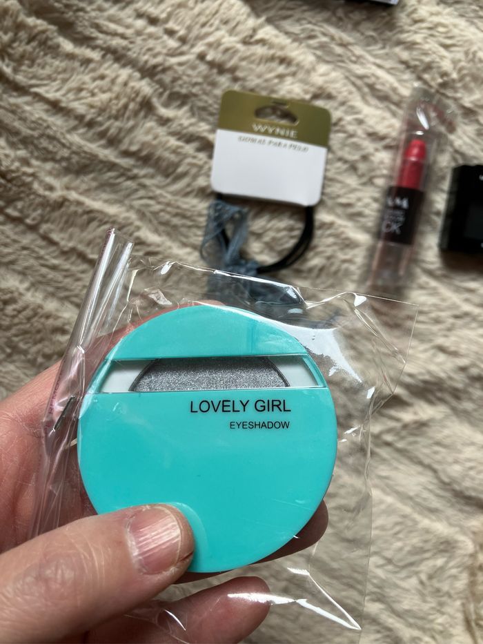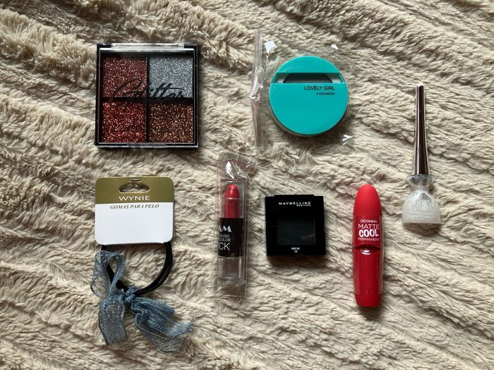 Lot de 7 produits de beauté/maquillage neufs ~ Je peux vendre à la pièce mais à partir de 2 produits: - Palette de 4 ombres à paupières Glitter D’Donna Beauty: Référence 11132A / Color 1: neuve à 1€50. - Ombre à paupières gris pailleté Lovely Girl: Référence 9907: neuve à 1€50. - Élastique de cheveux Wynie: Référence AP131763: neuf à 1€. - Rouge à lèvres Basic & Color M&M (dans les tons rouge, noté Rossetto): Référence 1125: neuf à 1€. - Rouge à lèvres Matte Cool Permanent D’Donna (noté Rossetto): Référence 12104A (numéro 1): neuf à 2€. - Fard à paupières Maybelline New York (couleur Night Sky 125): neuf à 2€. - Eyeliner Waterproof Romantic Forever avec paillettes holographiques: neuf à 1€. Lot vendu 10€ / Envoi soigné.