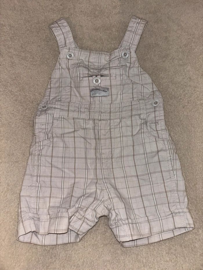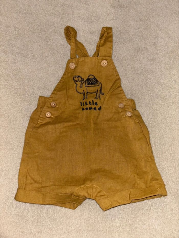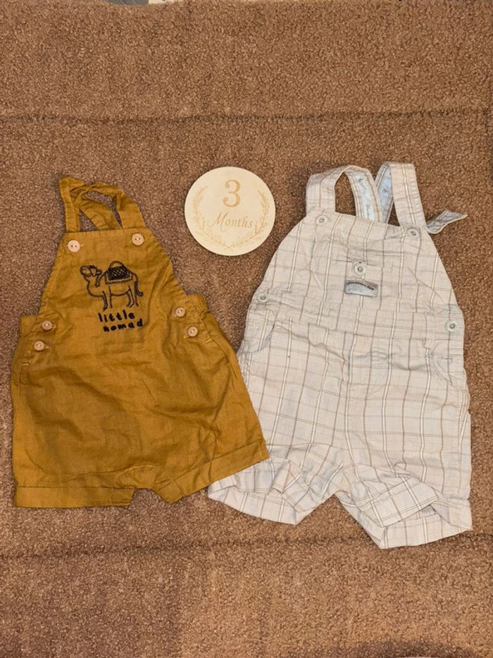 1 ère : Salopette / combinaison sergent major 3 mois Peu porte, très bon etat Bretelles réglables 2 ème : Combi short / salopette 3 mois kiabi Couleur sable Très bon état, peu porté