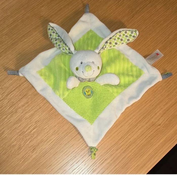 Nicotoy Doudou Plat Lapin Blanc Vert Hibou Oiseau pois Nicotoy