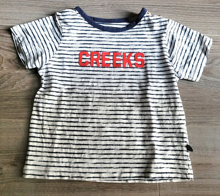 Tee-shirt blanc à rayures bleues manches courtes marque Creeks 18 mois