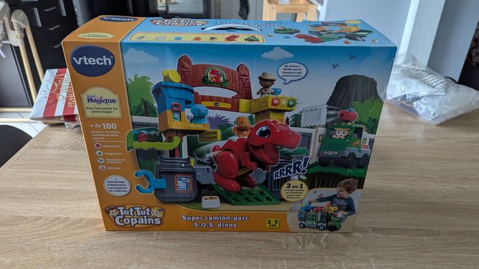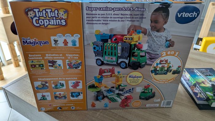 Super camion-parc S.O.S Dino NEUF Juste déballé et préparé pour Noël mais offert en double Vendu 55€ à Leclerc 1-5 ans Bienvenue au parc S.O.S. dinos ! Un camion 2 en 1 Tut Tut Copains transformable en parc à dinosaures. Avec son jouet camion interactif facilement transformable, votre enfant rejoint Joe, super véto pour partir en mission de sauvetage. Sa mission du jour ? Protéger les dinosaures en danger. Inclus : 1 personnage, 3 dinosaures, 2 accessoires et 1 véhicule + de 100 phrases, chansons, mélodies et effets sonores Réglage du volume sonore & arrêt automatique