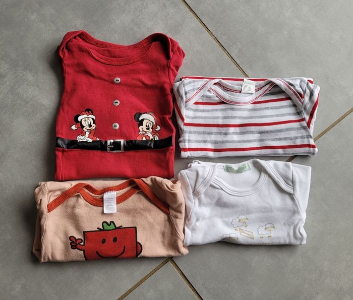 Lot de 4 bodys manches longues, dans les tons rouges, 1 Disney, 1 Mes Petits Cailloux, 1 Tissaia et 1 Monsieur Madame, taille 12 mois, en très bon état. Articles lavés pour la vente.