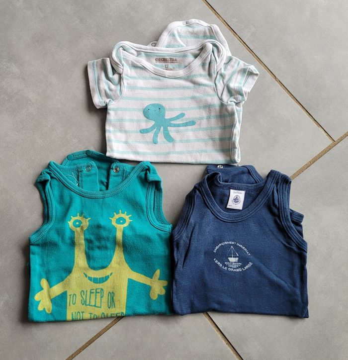 Lot de 3 bodys manches courtes, dans les tons bleu, 1 Petit Bateau, 1 Orchestra et 1 DPAM, taille 12 mois, en très bon état. Articles lavés pour la vente.