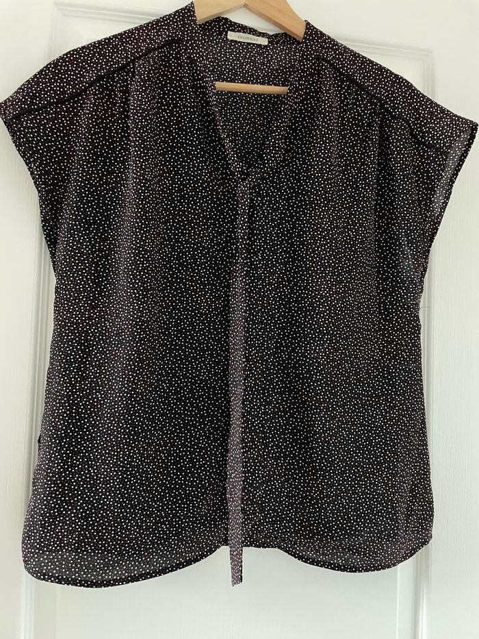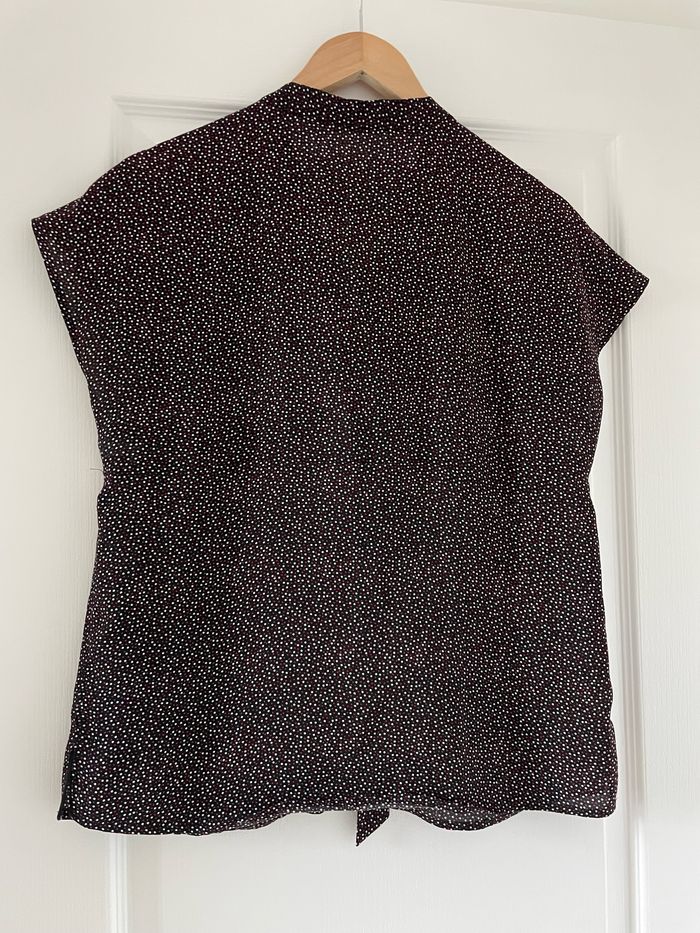 Haut fluide à manches courtes marron à pois, avec noeud sur le décolleté, en très bon état. Marque : Promod Taille : L