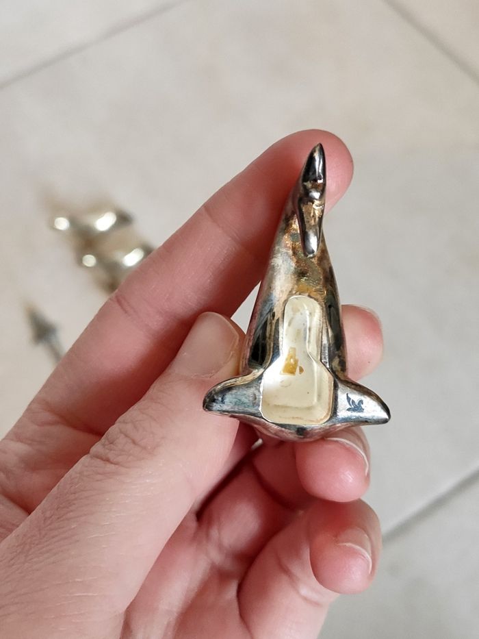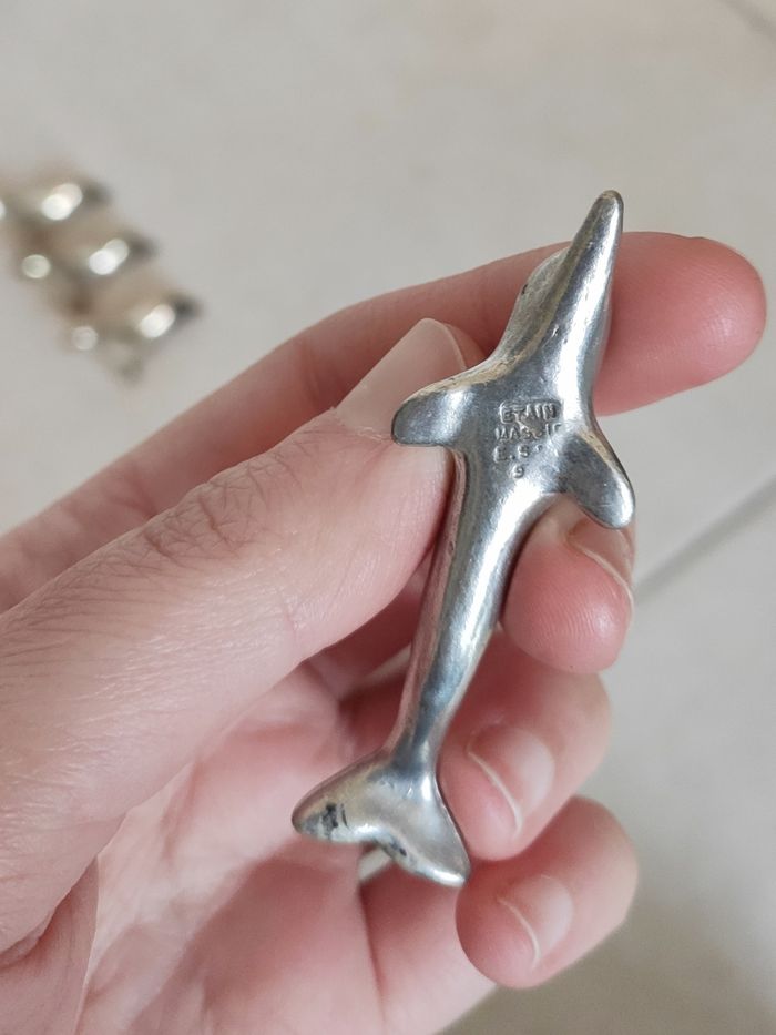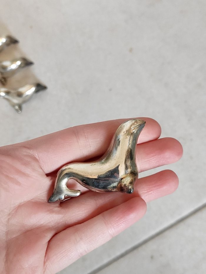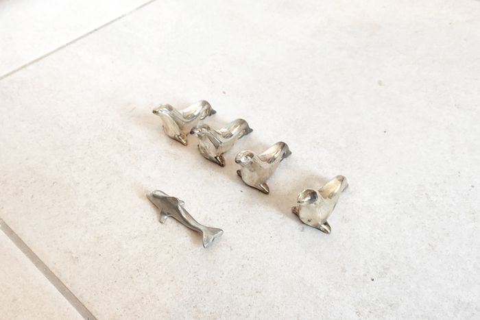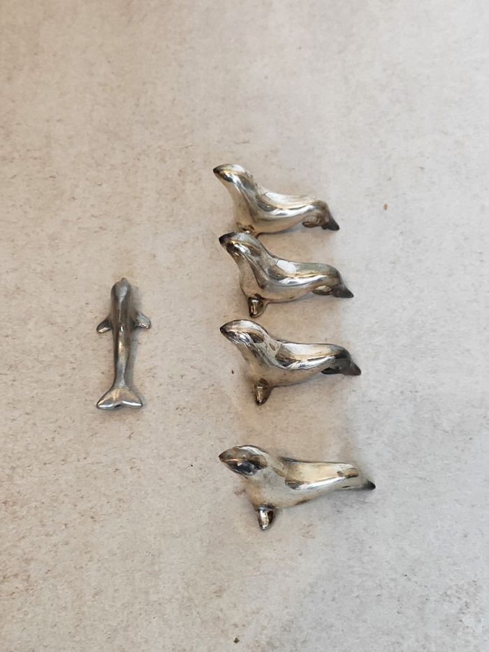 Lot de 4 phoques en métal argenté, repose couvert + Un dauphin en étain. Ancien