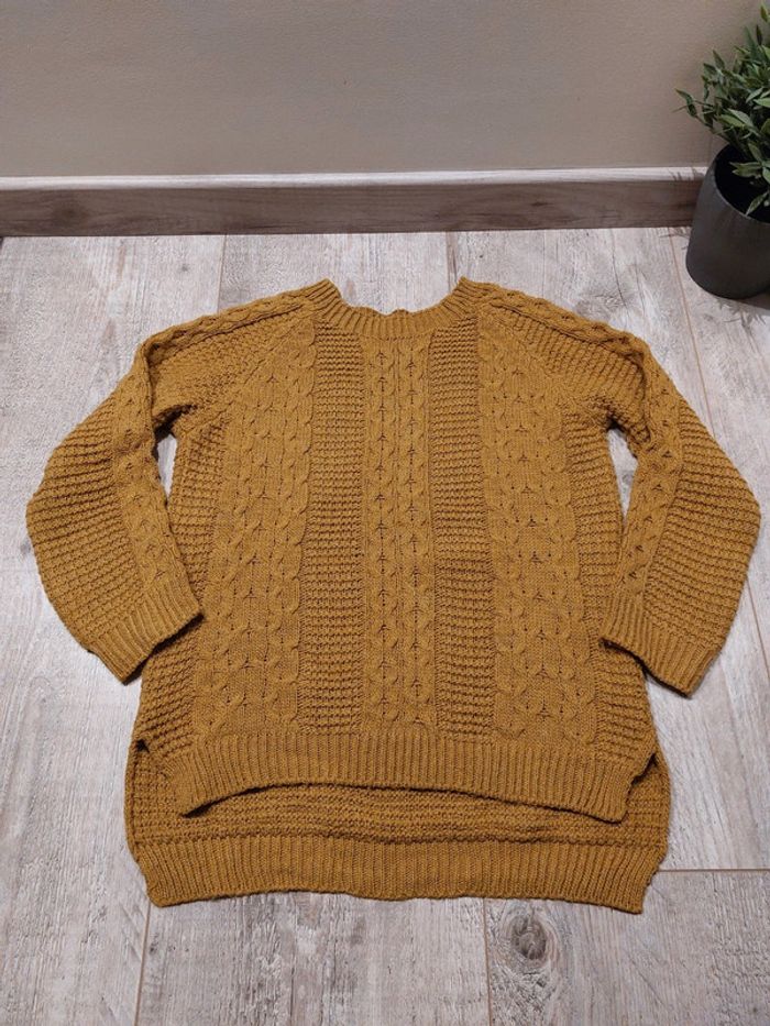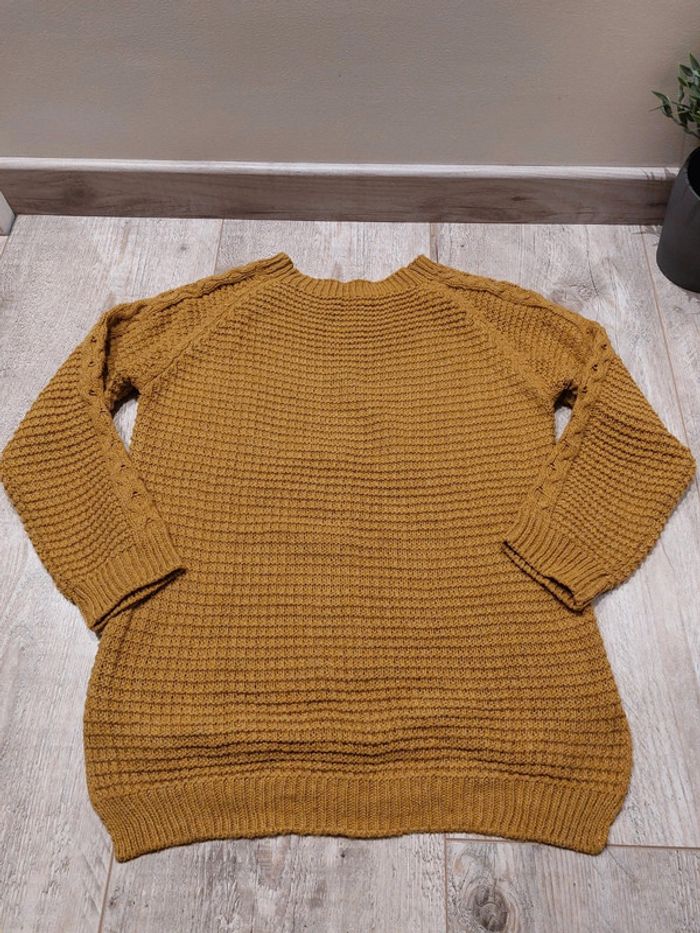 Pull maille couleur moutarde. Coupe plus longue derrière que devant. Convient pour un S-M (absence étiquette taille). Porté mais reste en bon état (petites bouloches peu visibles) #nana13242_femme_36ouS #nana13242_femme_38ouM