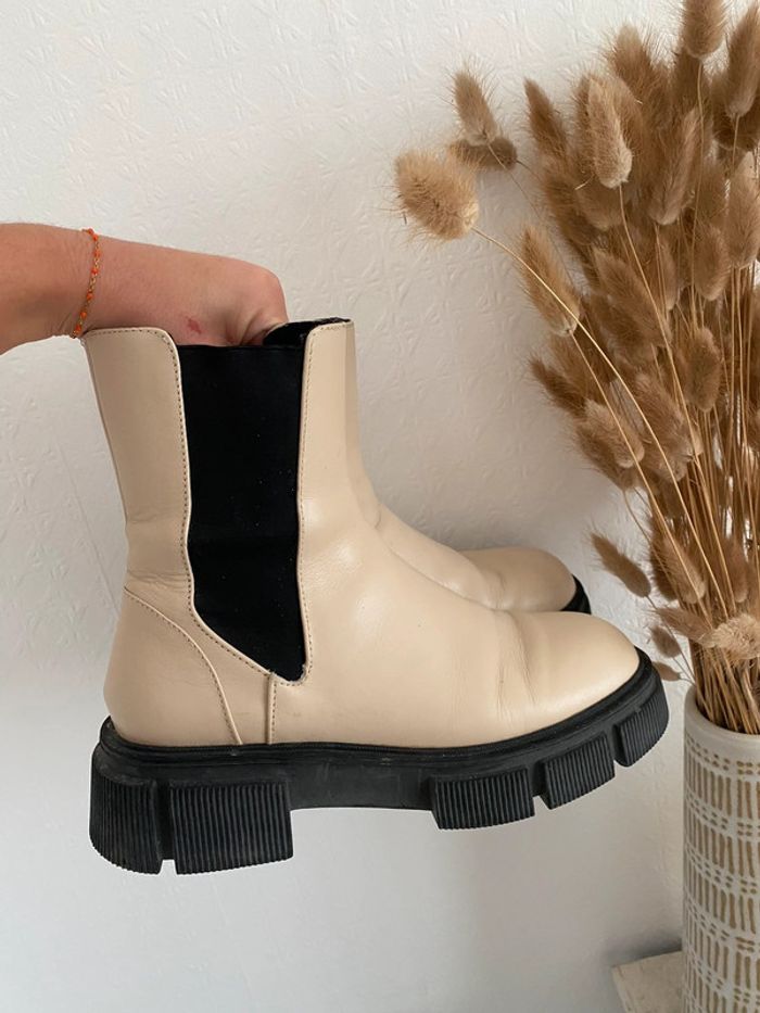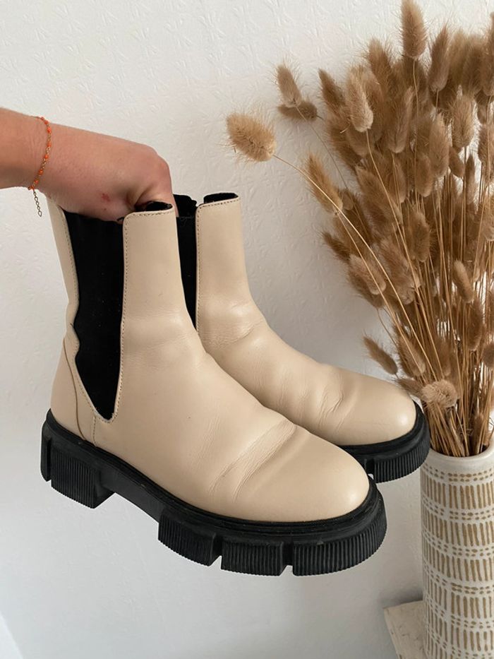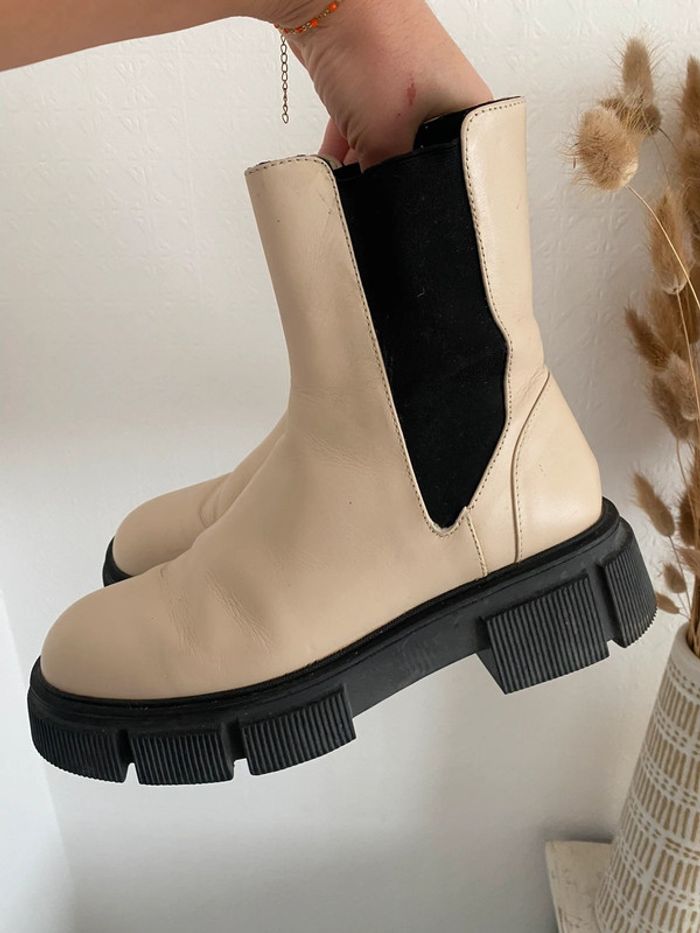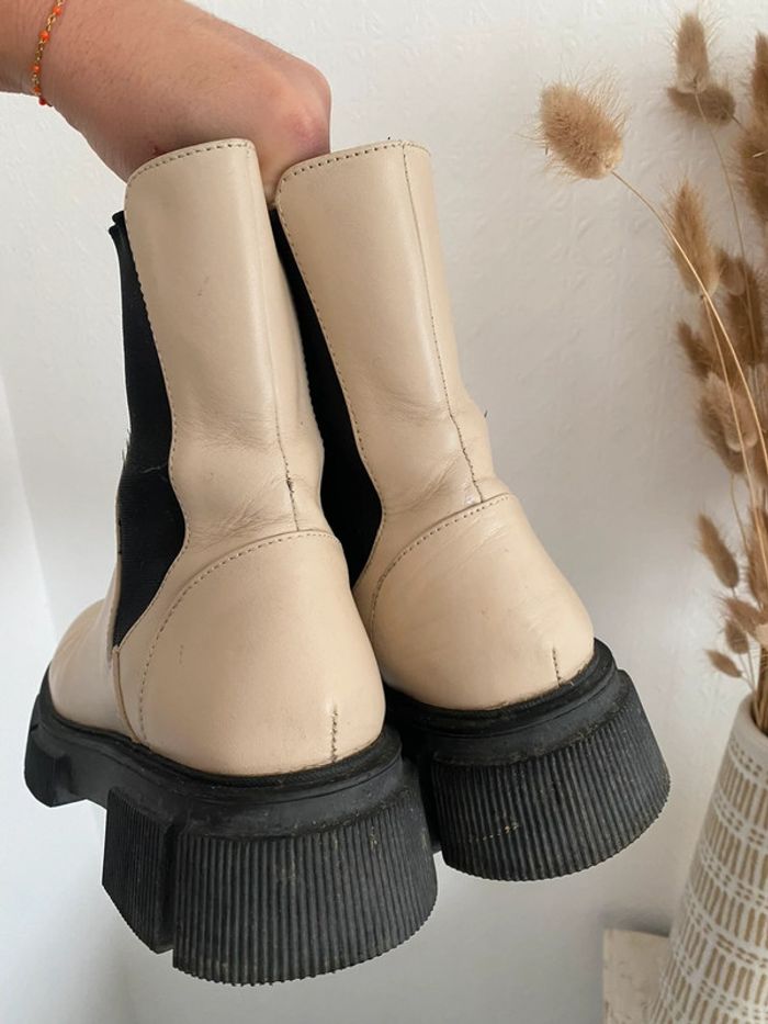 Bottines blanches crantées Zara Portées mais reste en bon état (sauf un petit point décousu sur une des bottines) Elles seront à nettoyer par l’acheteur #bottineschelsea #bottinesmihautes