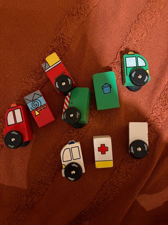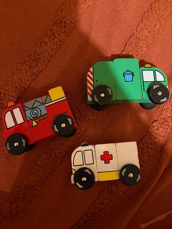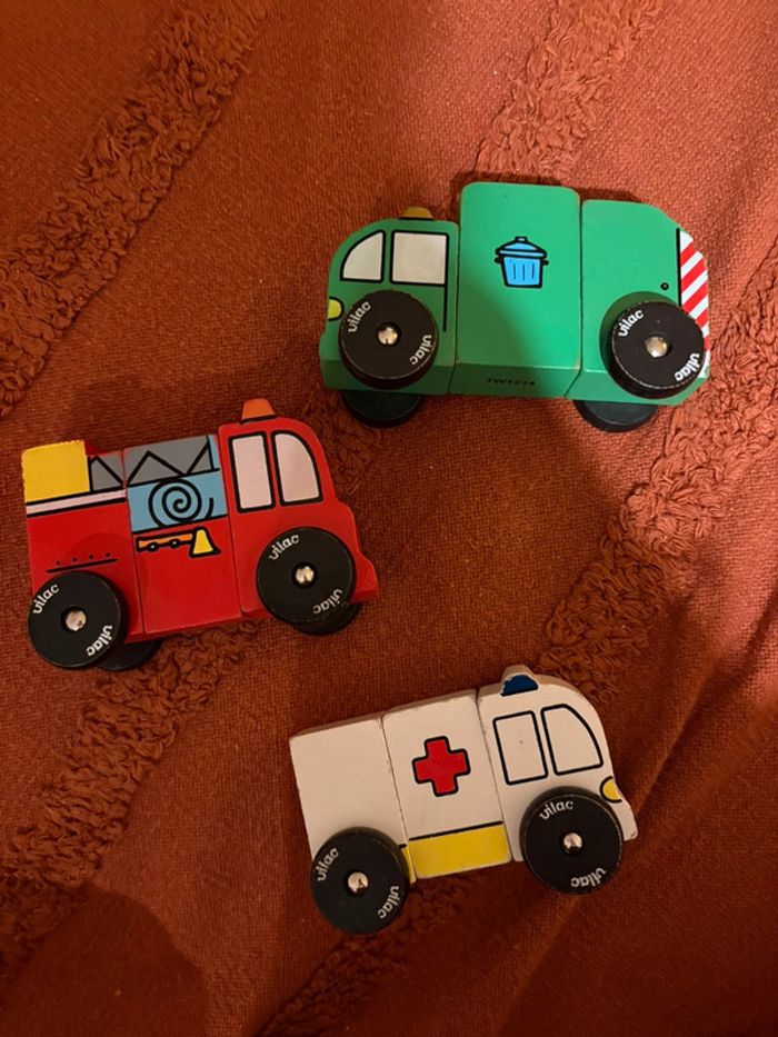 Lot de 3 véhicules en bois magnétique Vilac : - un camion poubelle - un camion de pompier - une ambulance Quelques traces d’usures lié à une utilisation normal mais reste en bon état