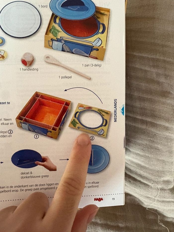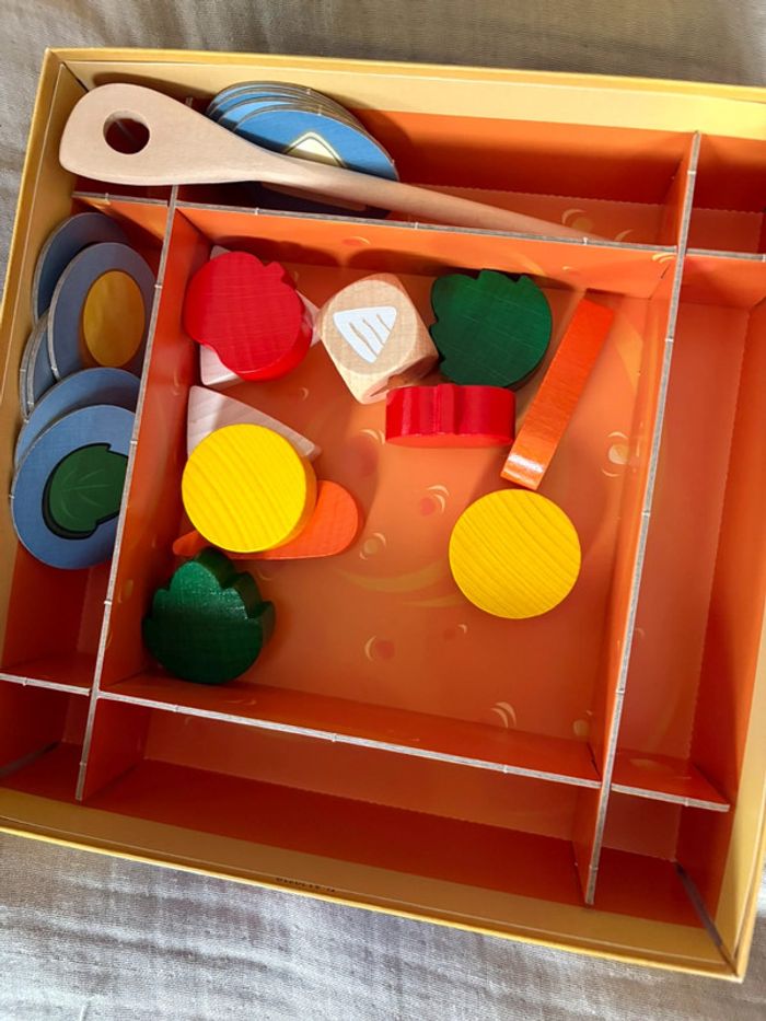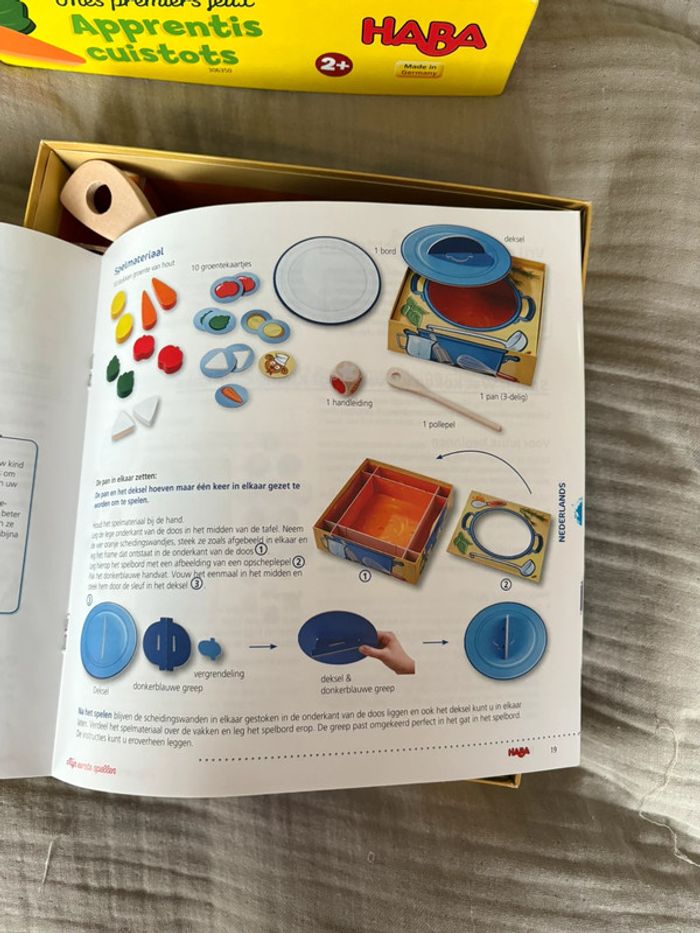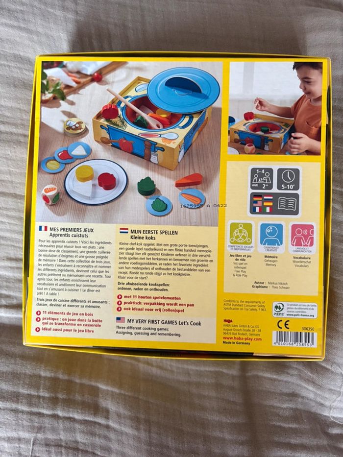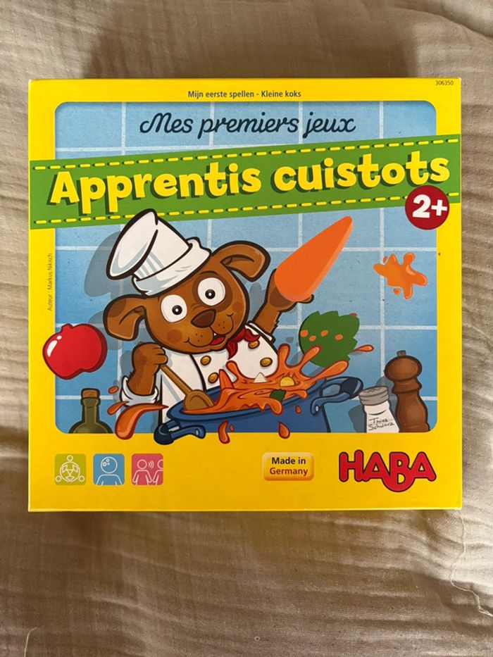 Jeu de société enfant : « Apprentis cuistot » À partir de 2 ans Le jeu est neuf et n’a jamais servi. Par contre il manque un élément (le couvercle : voir photo). Quand j’ai voulu regarder le jeu, je l’ai jeté sans faire exprès, je n’avais pas compris que ça faisait partie du jeu. J’ai regardé la règle et ça ne gêne pas pour jouer.