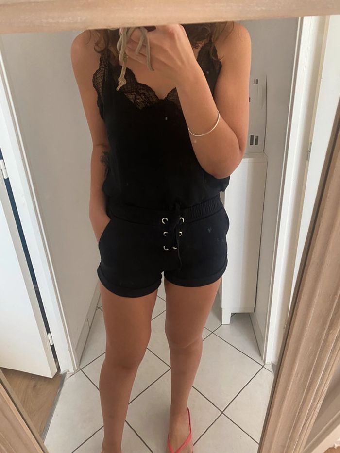Short noir molleton, lace up sur le devant Bershka Poches sur les côtés Élastique à la taille Portée simplement pour des photos portées en intérieur donc état proche du neuf Taille 36. Ok taille 34