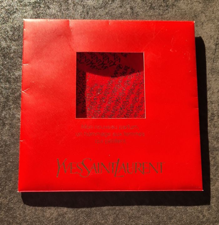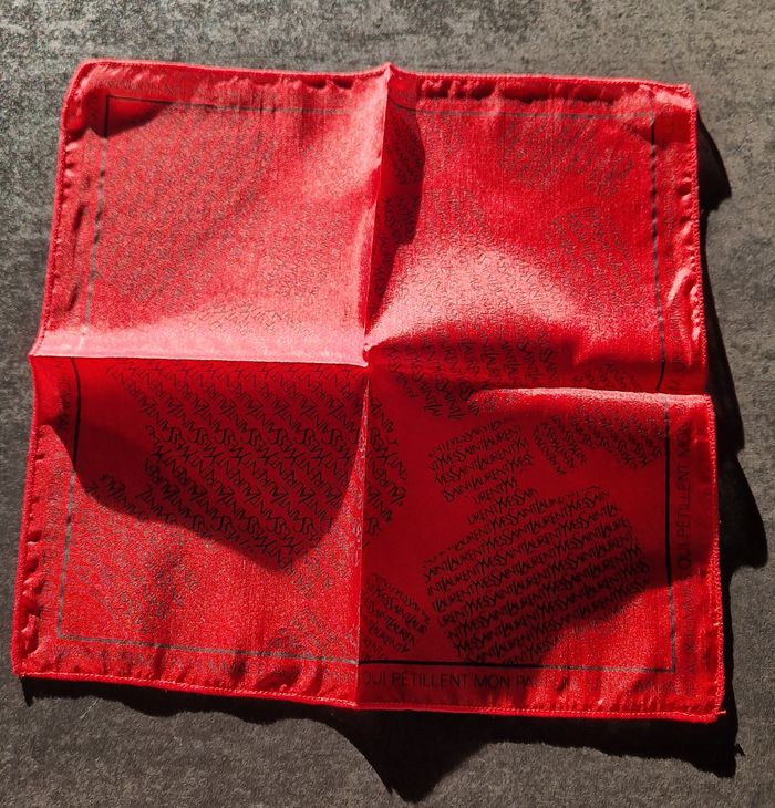 Pochette de costume pour femme Yves Saint Laurent, coloris garance Collector car cette pochette a été créée au moment où le parfum Champagne a perdu son nom, d'où le slogan entourant le carré Bel hommage à celui qui a inventé le smoking féminin mais la pochette peut être unisexe, j'imagine carré 20 x 20 cm, 100% soie Parfaitement NEUVE