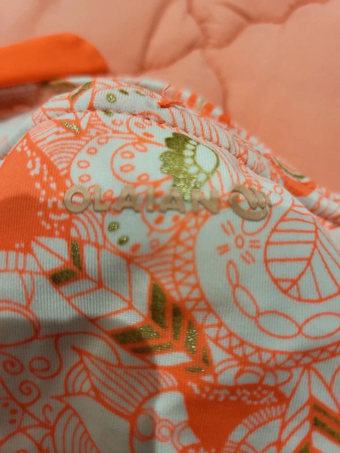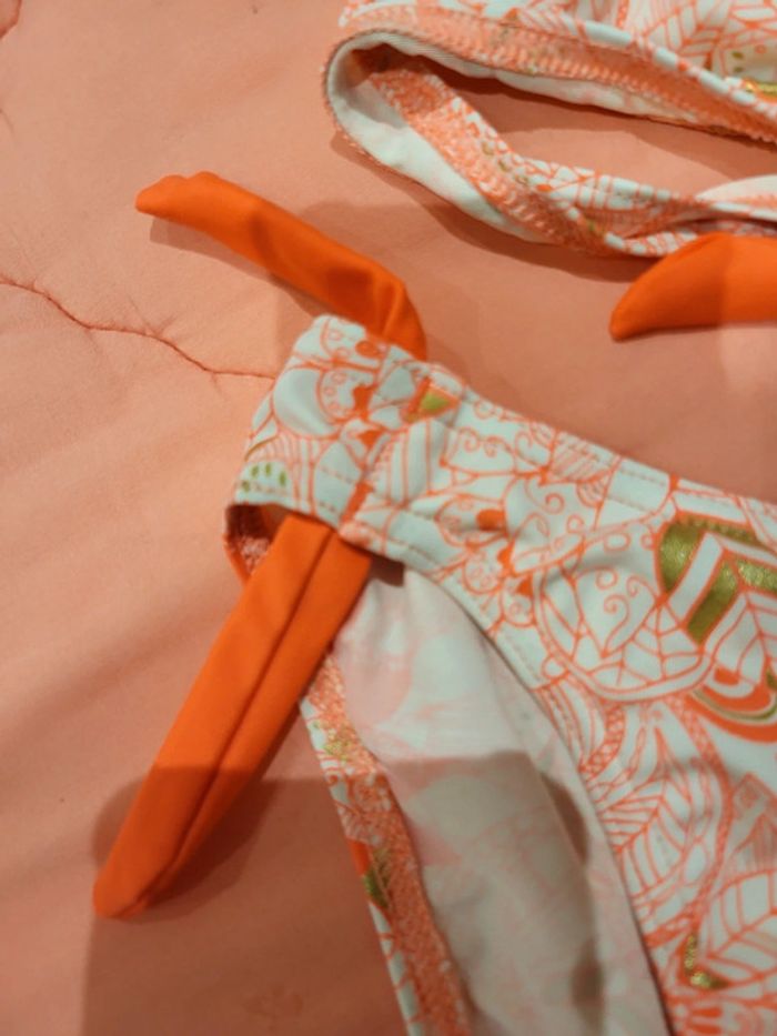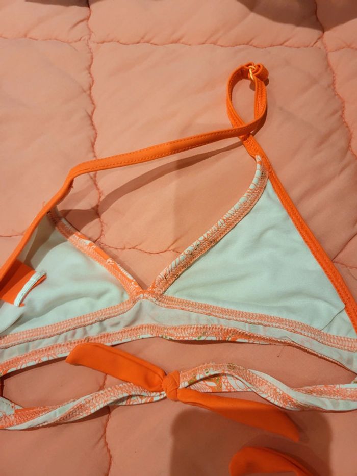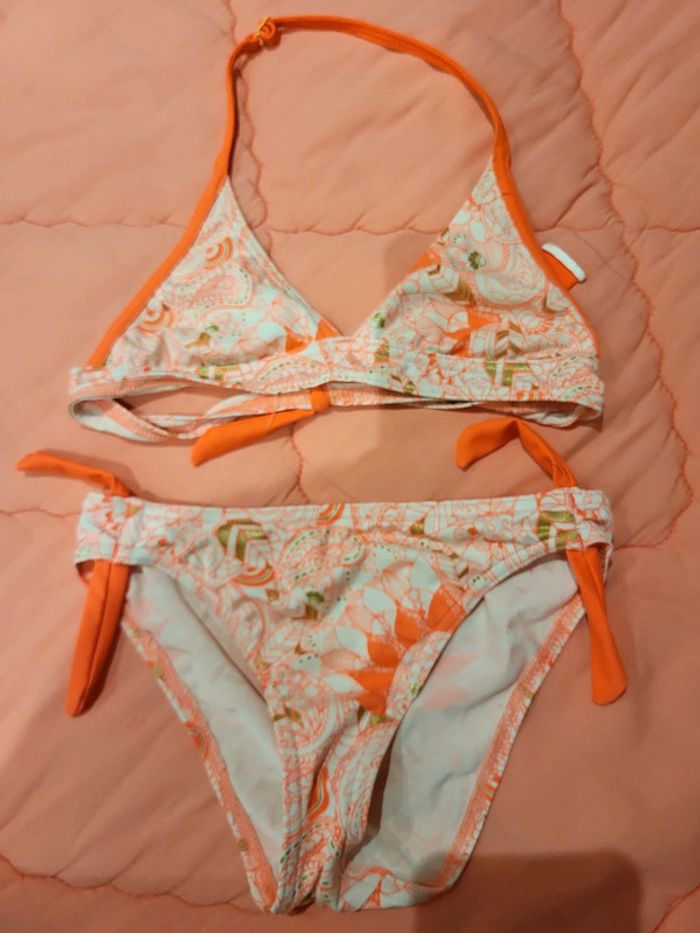 Maillot de bains 2 pièces triangle fille couleur corail fuchsia ne se voit pas bien sûr la photo. OLAIAN taille 12 ans