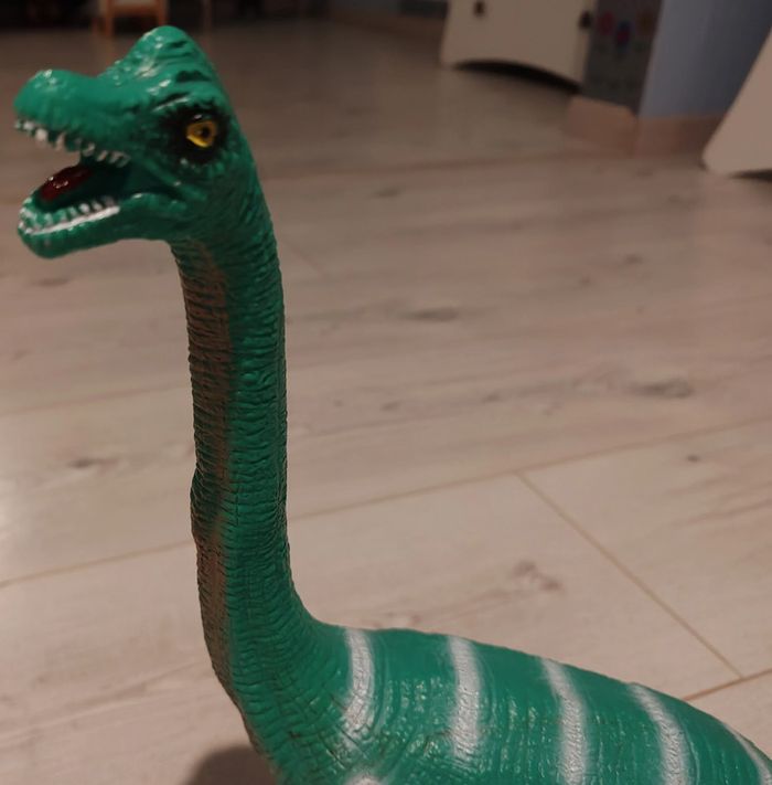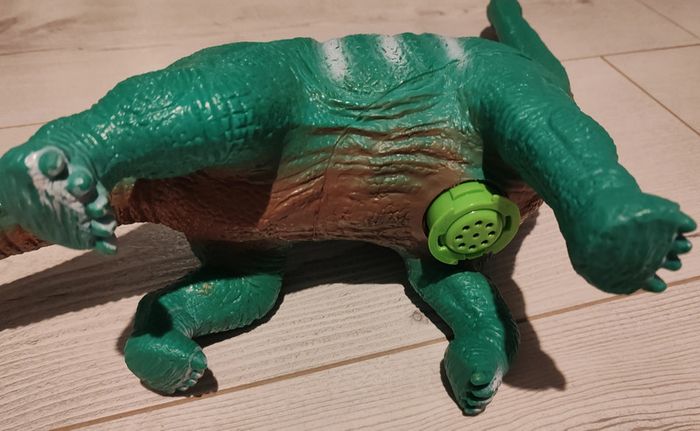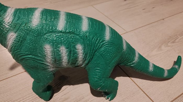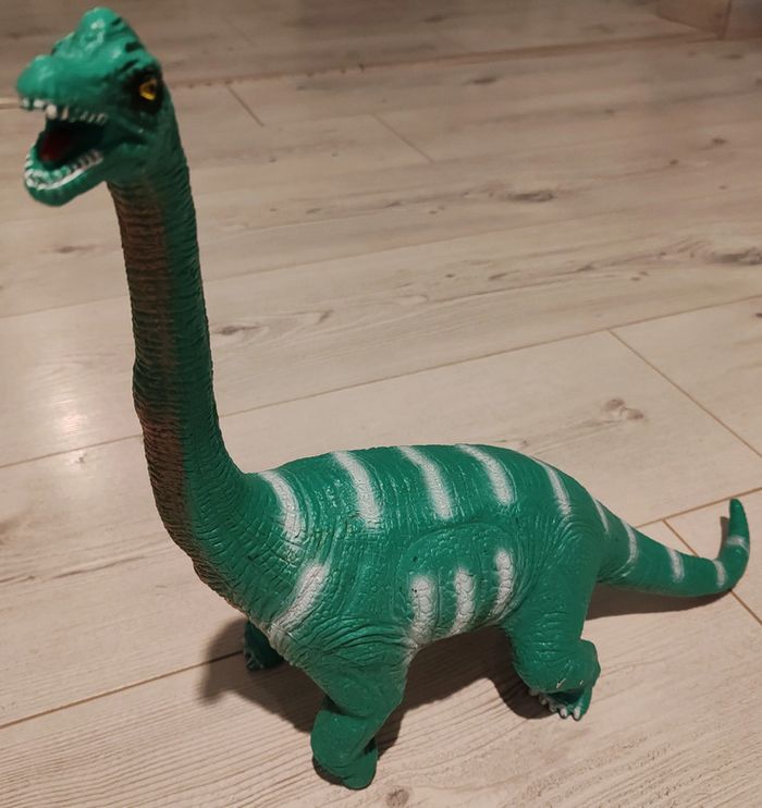 Grand dinosaure, en plastique mou. Bruit de dinosaure quand on appuie sur le bouton en dessous de la figurine (voir photo 6) Dimension : hauteur 40 cm, longueur 40 cm. Fonctionne avec 3 piles LR44 qu'il faut surement changer. En très bon état. D'autres jouets sont en vente dans mon dressing, réduction sur les lots à partir de 2 articles achetés.
