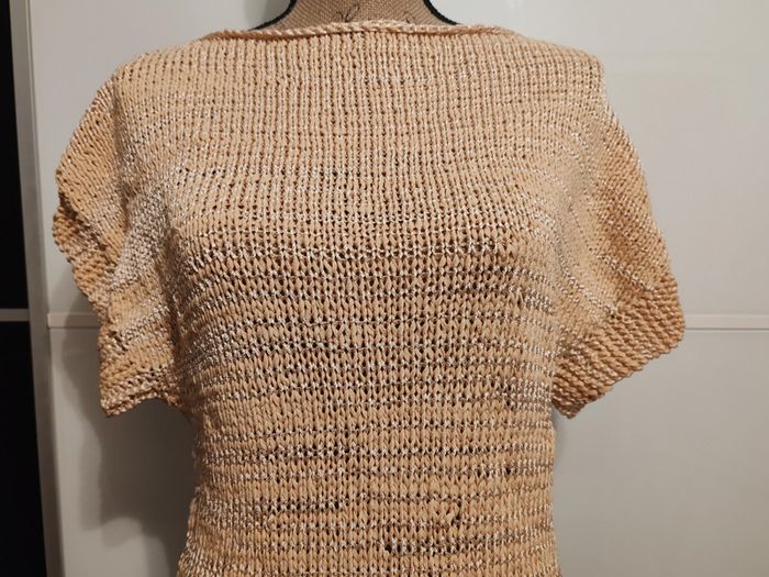 Pull manches courtes taille 40 tricoté à la main par ma maman qui était passionnée par le tricot et couturière de métier. Orange clair et blanc. Neuf jamais porté mais je crois qu'il y a des petits défauts (mais je n'y connais rien en tricot), prix en conséquence. Dimensions à plat : - hauteur 62 cm - poitrine 43 cm D'autres vêtements sont en vente dans mon dressing, réduction automatique sur les lots à partir de 2 articles achetés et frais d'envoi le moins cher possible.