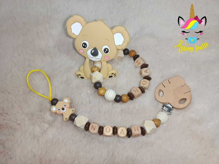 Coffret composé de: - 1 Attache tétine - 1 Hochet grand De la collection Koala. Respect des normes CE, composée de perles silicone alimentaire et/ou bois naturel. 100% personnalisable, énormément de choix de clips, perles, etc… Envoyez-moi un message afin de créer main dans la main votre coffret idéal. Une photo du prototype de celui-ci vous est envoyé pour validation avant envoi.