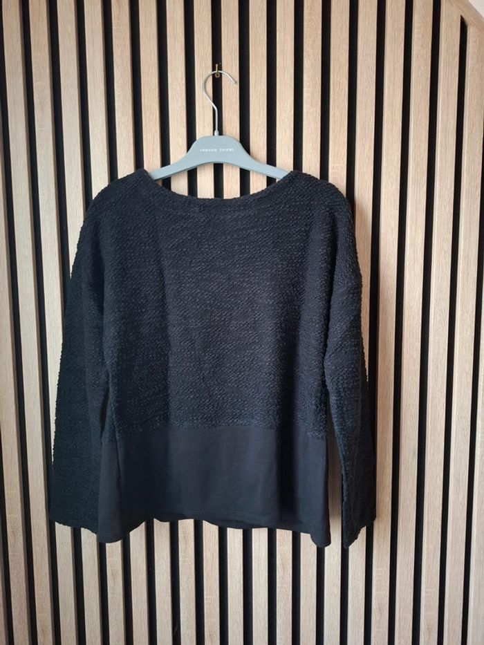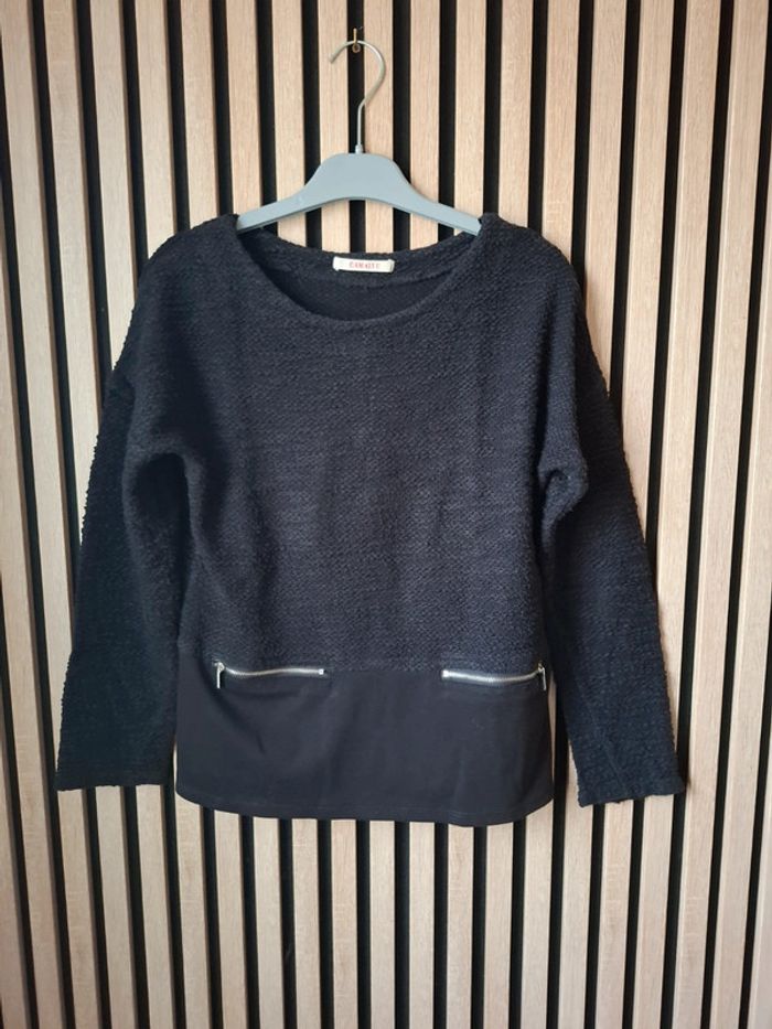 Joli pull noir avec une bande et 2 fausses poches dans le bas . Mesures à plat Aisselles 48 cm Longueur 55 cm Composition : polyester Coton viscose Élasthane N hésitez pas à visiter mon profil et laissez vous guider par mes différents # #clémentine13430femmest36 #hautnoir36 #pullcamaieu36 #blousenoire36