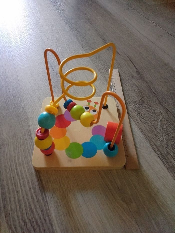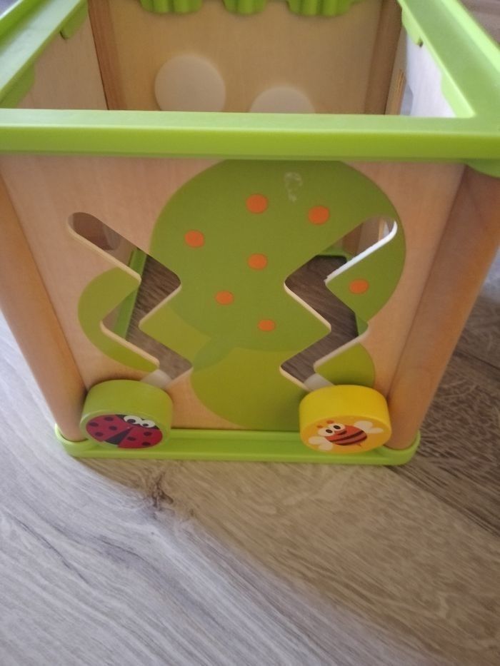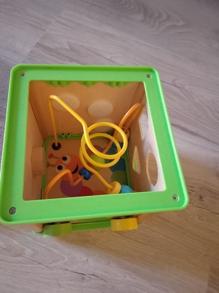 Vends un cube carré de 14,5 cm. Plusieurs activités. En bois. Complet. Fond rayé sur le bois.