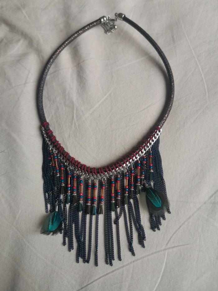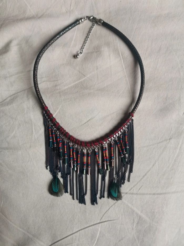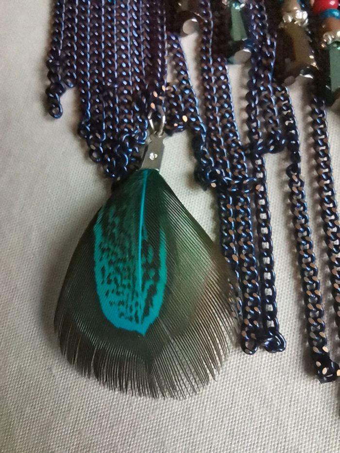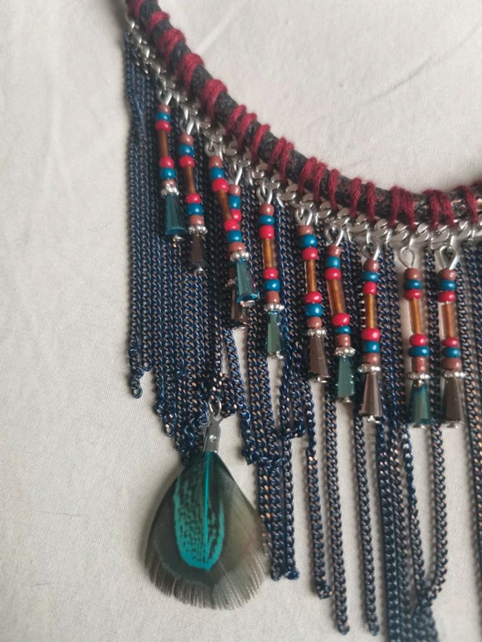 Collier avec Breloques et chaînes pendantes, avec plumes. Longueur règlable : entre 48 et 54 cm #nathaliesalabijoux #nathaliesala1petitprix Collier ras de cou indien plumes plastron bohème hippie ethnique