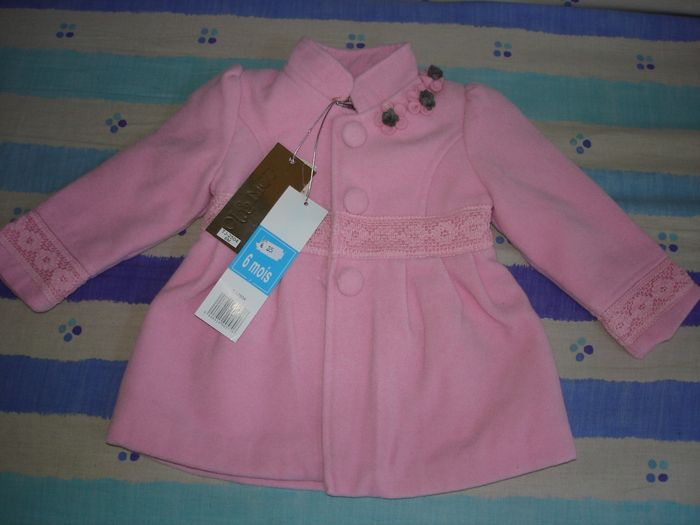 couleur: ROSE uni avec petites broderies assorties et des petites roses grises dans le haut du col Matière: 90% POLYESTER + 10% RAYON MANTEAU NEUF, jamais porté, encore étiqueté (acheté 35€)