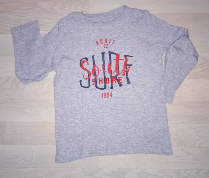 Lot de 2 tee-shirts gris chiné clair motif surf, idéal pour des jumeaux Marque : Tex T. 7-8 ans NEUFS jamais portés juste lavés